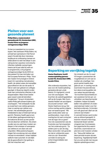 Beperking en verrijking tegelijk Hester Daelmans, hoofd masteropleiding genees kunde VU, Amsterdam UMC, locatie VUmc Alle onderwijs stopzetten, het was voor de masteropleiding geneeskunde een uniek besluit. En ingrijpend, vooral voor de coschappen. “We brachten de opleidingsplekken zelf op de hoogte. Met Zoomsessies hielden we vervolgens structureel contact”, blikt Hester Daelmans terug. Dat online overleg werkte volgens haar verrassend goed. “We gaan straks zeker weer op werkbezoeken, maar online overleg kan bij veel contacten met de regio net zo goed.” Voor de coassistenten was de frustratie over het stopzetten van het onderwijs groot. “Ze wilden juist nu aan de slag. Maar wij konden niet garanderen dat er voldoende super visie zou zijn. Bovendien vormden te weinig be schermingsmiddelen een probleem.”