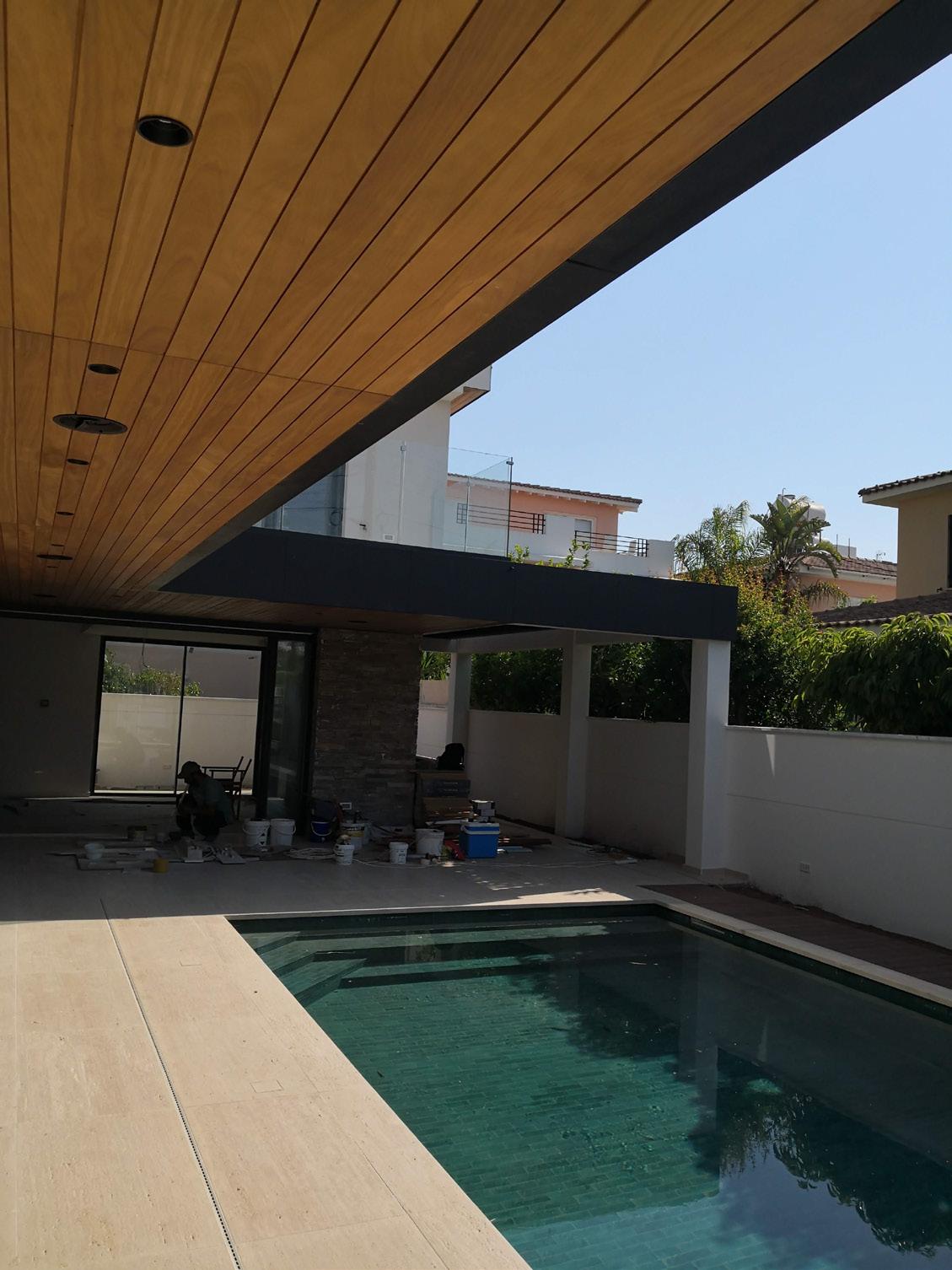 πάχους 4χιλ. Υφιστάμενος πηλός. Καθαρίζει τοπικά για την εισδοχή της λαμαρίνας υδρορροής και της υγρομόνωσης και προστίθεται νέος. Ξύλο επένδυσης πάχους 20χιλ. επιλογής Ε.Α. Ασφαλτόπανο πάχους 4χιλ. Νέα μεταλλική ενίσχυση για στήριξη των δοκίδων και υδρορροής Τελλάρο από μορίνες διατομής 30Χ30χιλ. για στερέωση ξύλινης επένδυσης Ξύλο επένδυσης marine plywood πάχους 20χιλ. Δέχεται βερνίκι του νερού. Κρεμάζει 2εκ. προς τα κάτω για δημιουργία νεροχύτη Ξύλινες δοκίδες διατομής 75X50χιλ. εσωτερικά για στερέώση της υδρορροής Υδρορροή από λαμαρίνα γαλβανιζέ πάχους 1.5χιλ. χρώματος μαύρο. Υπερχείλιση στα πλάγια Γωνιά από λαμαρίνα γαλβανιζέ για συγκράτιση χαλίκιων χρώματος μαύρο επιλογής Ε.Α. Ξύλινες λωρίδες ραμποτέ από ξύλο Iroko με βερνίκι νερού Φωτισμός με spotlights OSB πάχους 18χιλ. 0.04 Κρυφός φωτισμός LED περιμετρικά των μεταλλικών δοκών Κρυφός φωτισμός LED περιμετρικά των μεταλλικών δοκών Μορίνα για στήριξη φωτισμού LED. 0.07