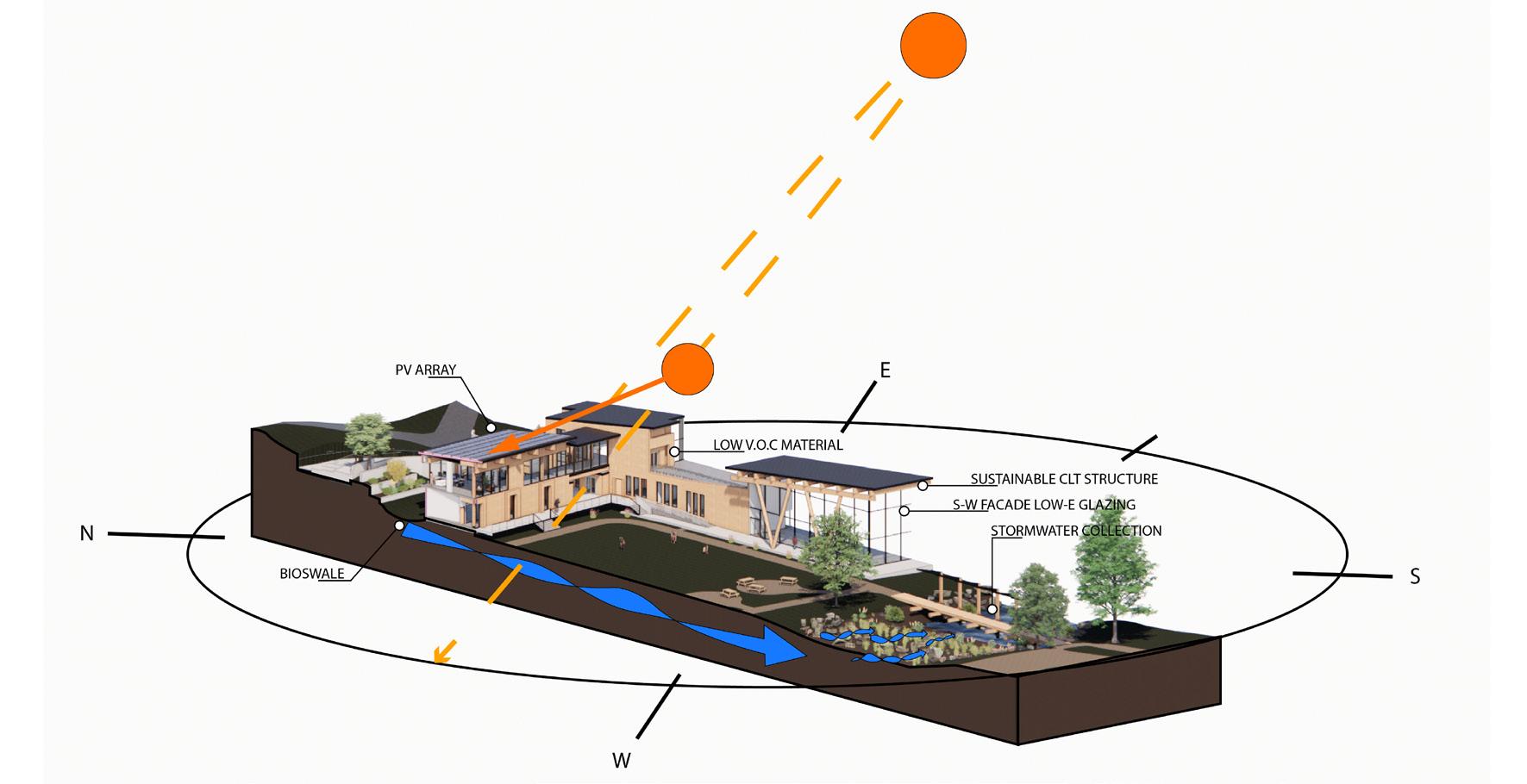 The building utilizes a greywater recycling system to reduce source water consumption as well as geothermal heating and cooling with the use of a concrete floor to radiate heat. Photovoltaic arrays provide adequate electrical demands for workers and visitors. Building materials are CLT wood, slate siding a recycled wood for interior finishes and were chosen based on their low embodied carbon.