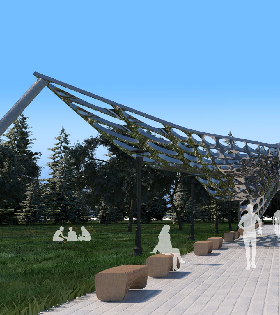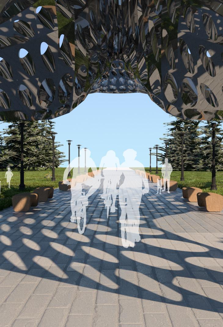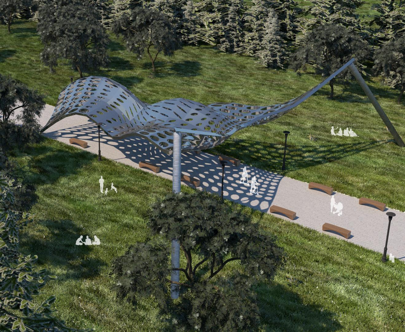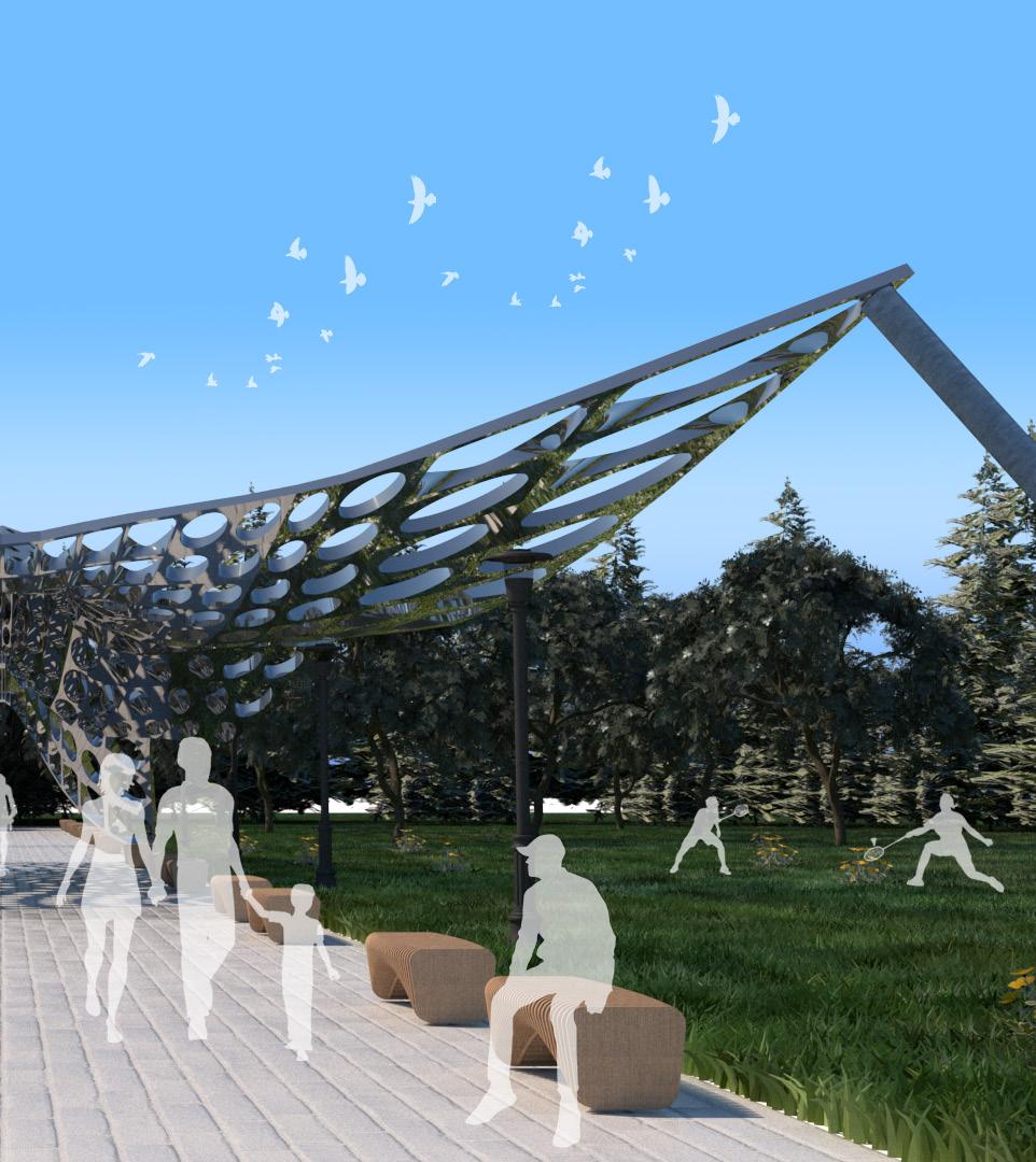 The Butterfly Pavilion imagines an outdoor space where air and lightness are themes of the location. Surface modules of varying size openings are dictated by a curve attractor nearest the edge of the “wings” and axial spine of the canopy. The surface module also studies how light and shadows interact with the structue as well as mimic the porosity of birds bone density which give them the ability to fly. The high polish steel also serve as a physical reflection of human aviation successes.