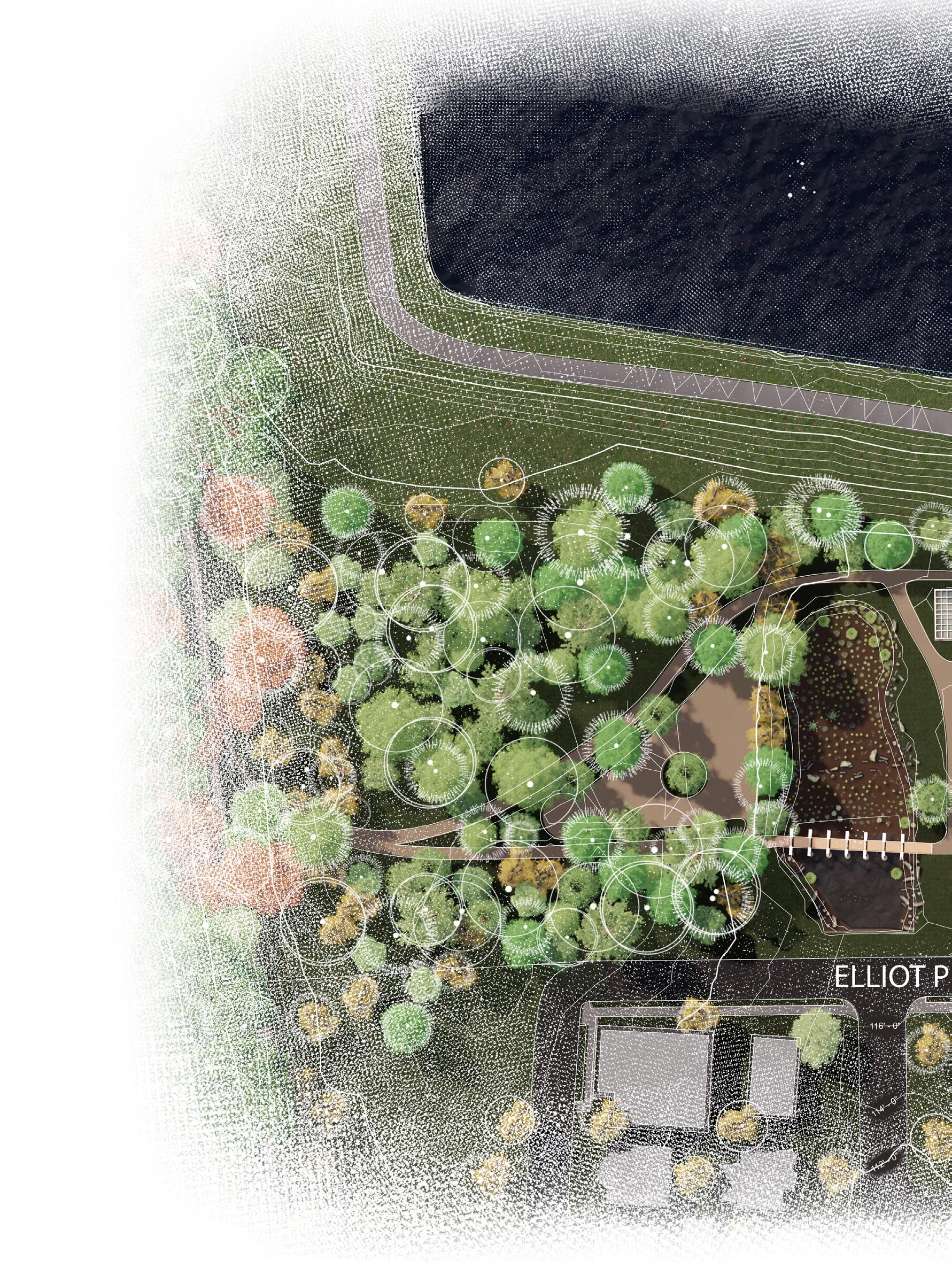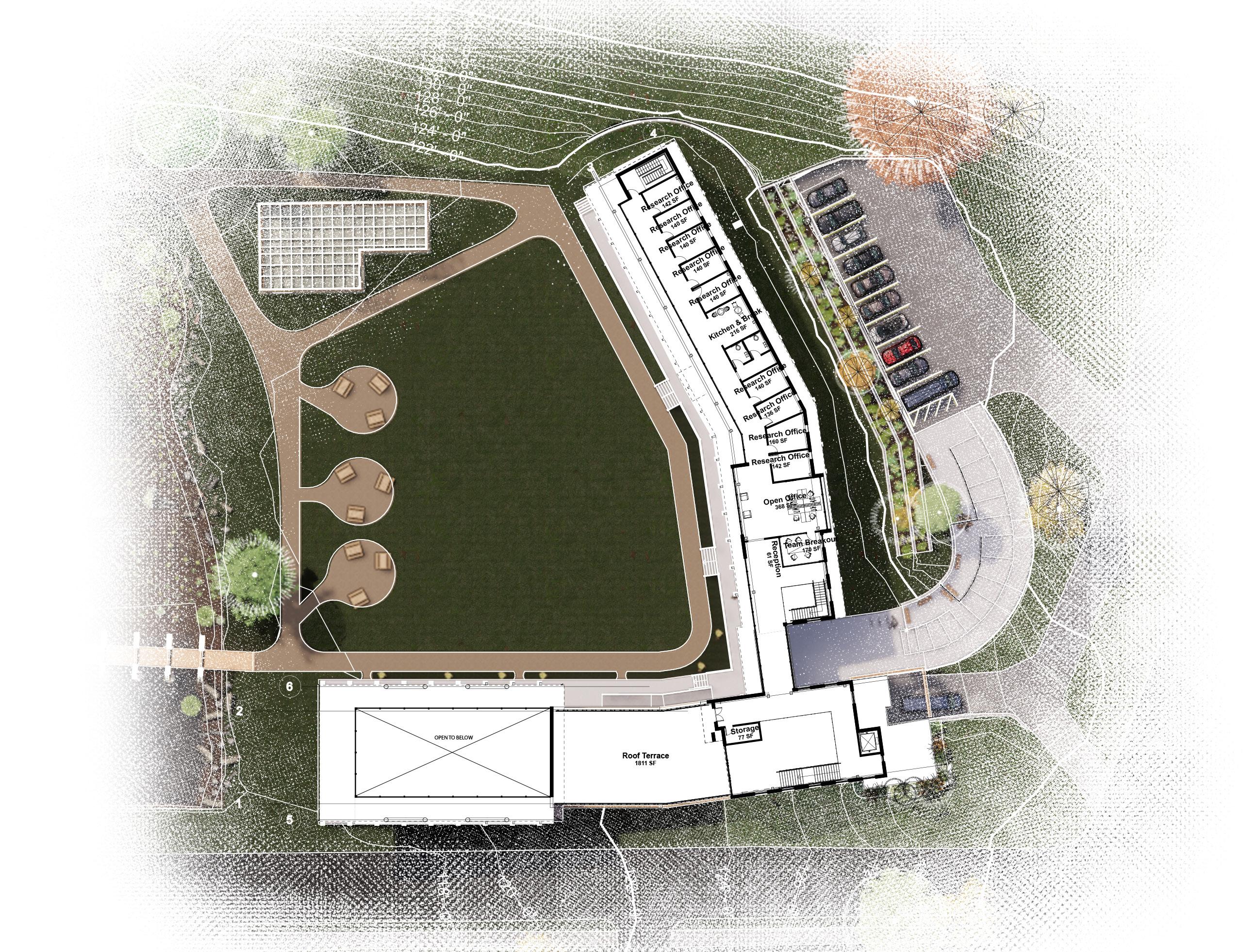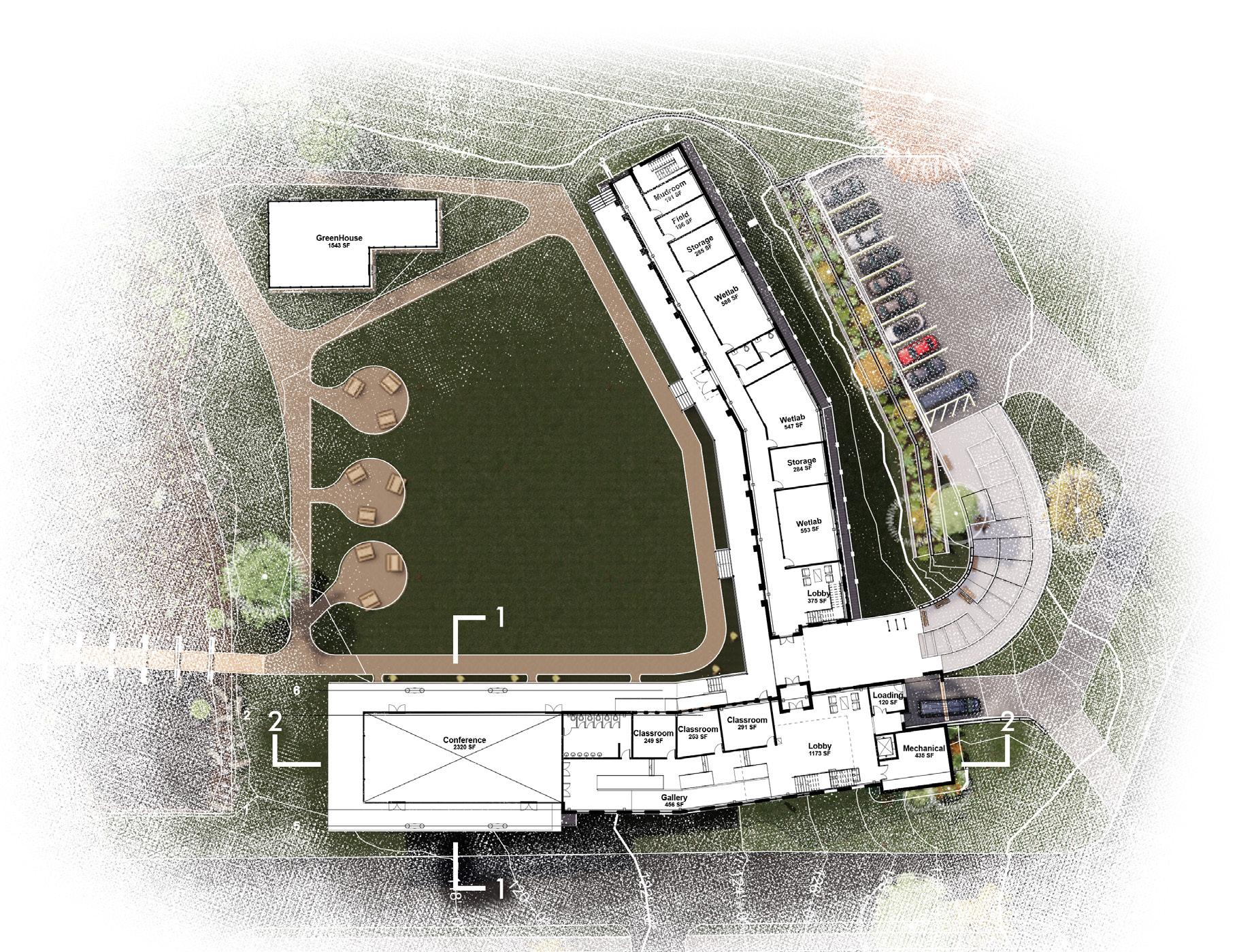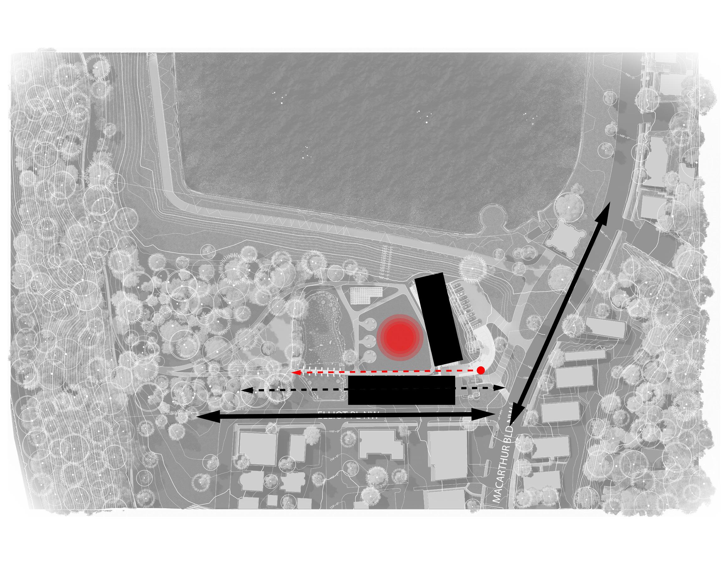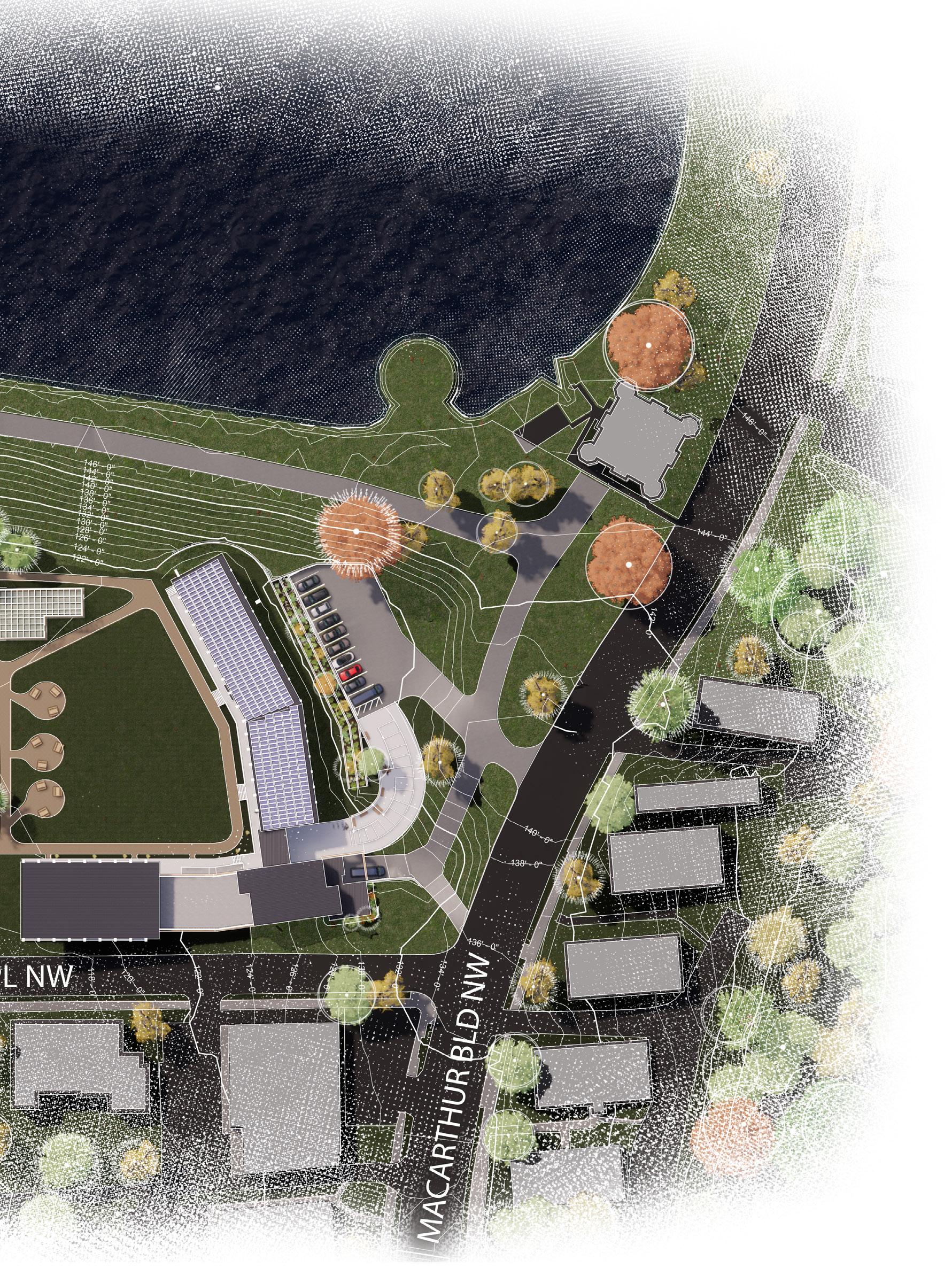 Located in the Georgetown neighborhood of Washington, D.C., Macart Discovery Center functions as the National Park Service’s new Center for Urban Ecology. Utilizing the street edge and the imposing hill created by the reservoir, the positioning of the building and its orientation creates a sense of place for it inhabitants and encourages exploration for the curious observers. Macarthur Blvd and Elliot Pl NW facade offers a modest yet amicable facade. Courtyard elevations offer a more revealing view into the reclaimed landscape, yet through the layering of its plane, much remains to be discovered beyond the walls. Material selection, orientation, & passive site strategies such as a constructed bog are a few sustainable practices imlemented into the site.