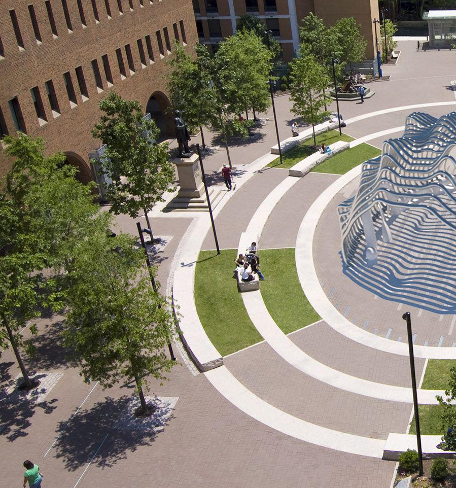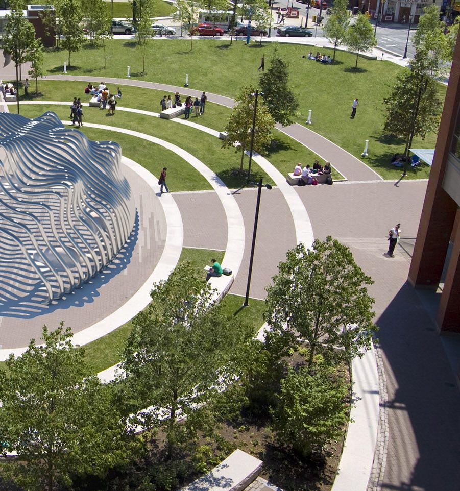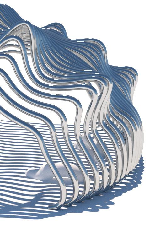 Inspired in part by the Cloud Gate, The Hedge pavilion is centered around fluidity. The high polished steel is made to resemble mercury, one of the few metals that exist in a liquid state at room temperature. During certain months of the year, the casted shadows give the impression of moving waves, contributing to the overall theme of dynamism.
