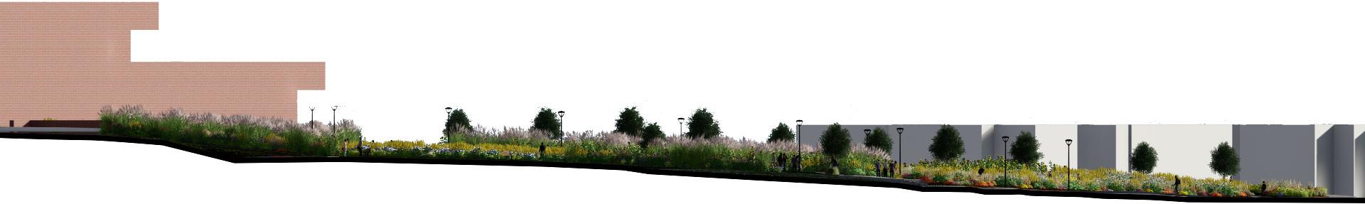 Although the zoo is to be removed, the existing trees which host a variety of bird species are to be kept. This creates an urban forest and a transition zone from adjacent sites into the park along the right edge.