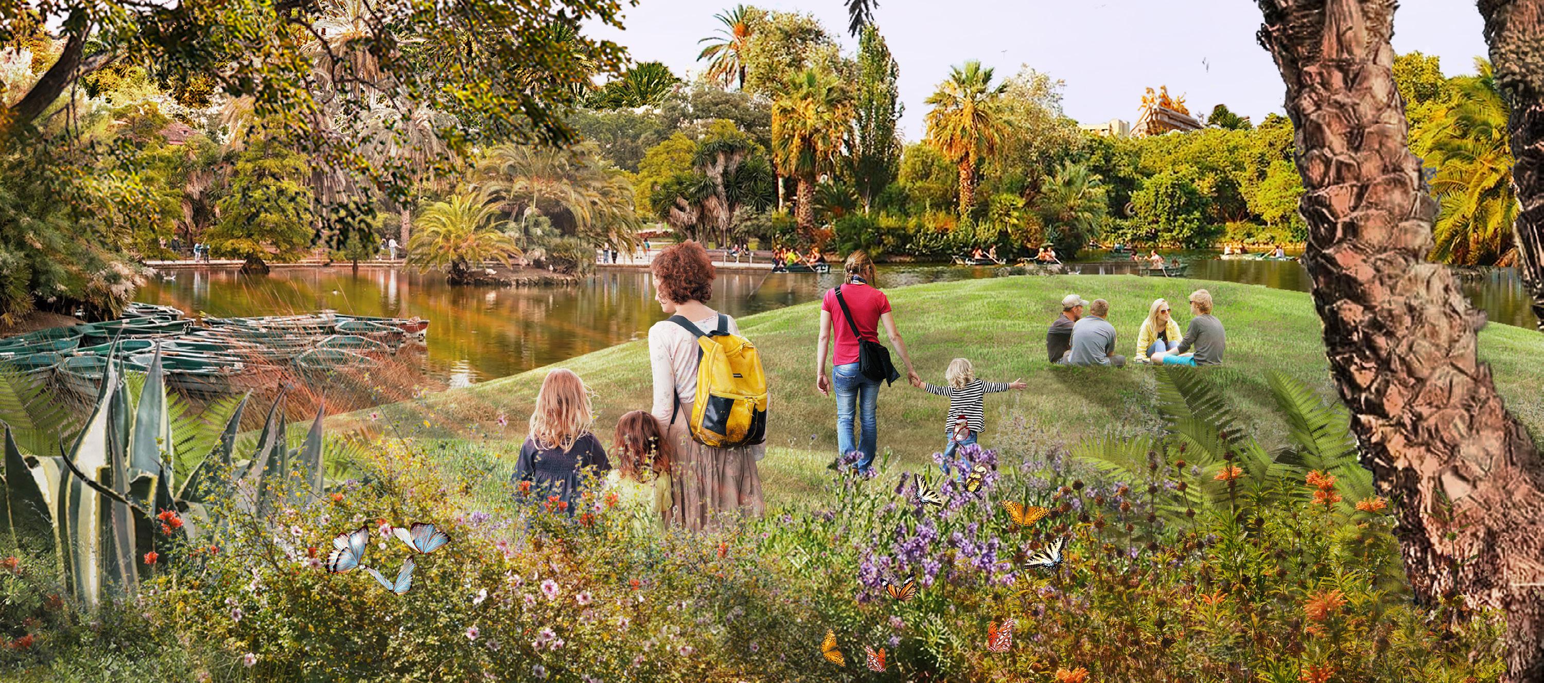 Topography is used as a tool to create seamless transitions between land and water. The edge of the pond is to be transformed from its currently hard edge to an area of native vegetation which supports Barcelona’s native birds and organisms.