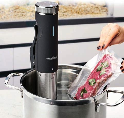 Machine à cuisson sous-vide "Stick" Boîtier en acier inoxydable avec poignée ergonomique soft-touch, contrôle électronique de la température (écart maximal ± 0,5°C), y compris yaourtière, fonction maintien au chaud et décongélation, circulation d'eau : 7 - 8 l/min. Réglage de la température de 0°C à 90°C. 066706