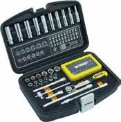 72-tands ratel, super lockaansluitingen, super lock lange doppen, 3 wiebelverlengstukken, 1 flexibele verlengstang, 1 glijdende T-balk, 32-delige bitbox PH / PZ / SL / Hex / Torx-sabotage, magnetische snelkoppelbithouder, bit-aansluiting voor 1/4 bits. 339368/S
