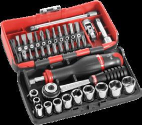 1x cliquet. 10x douilles. 21x embouts. 1 x Embout porte-douille. 1x Cardan universel. 1x Douille porte-embout à jonc de retenue standard. 1x Poignée tournevis. 2x Rallonges. 041111/D - 277517