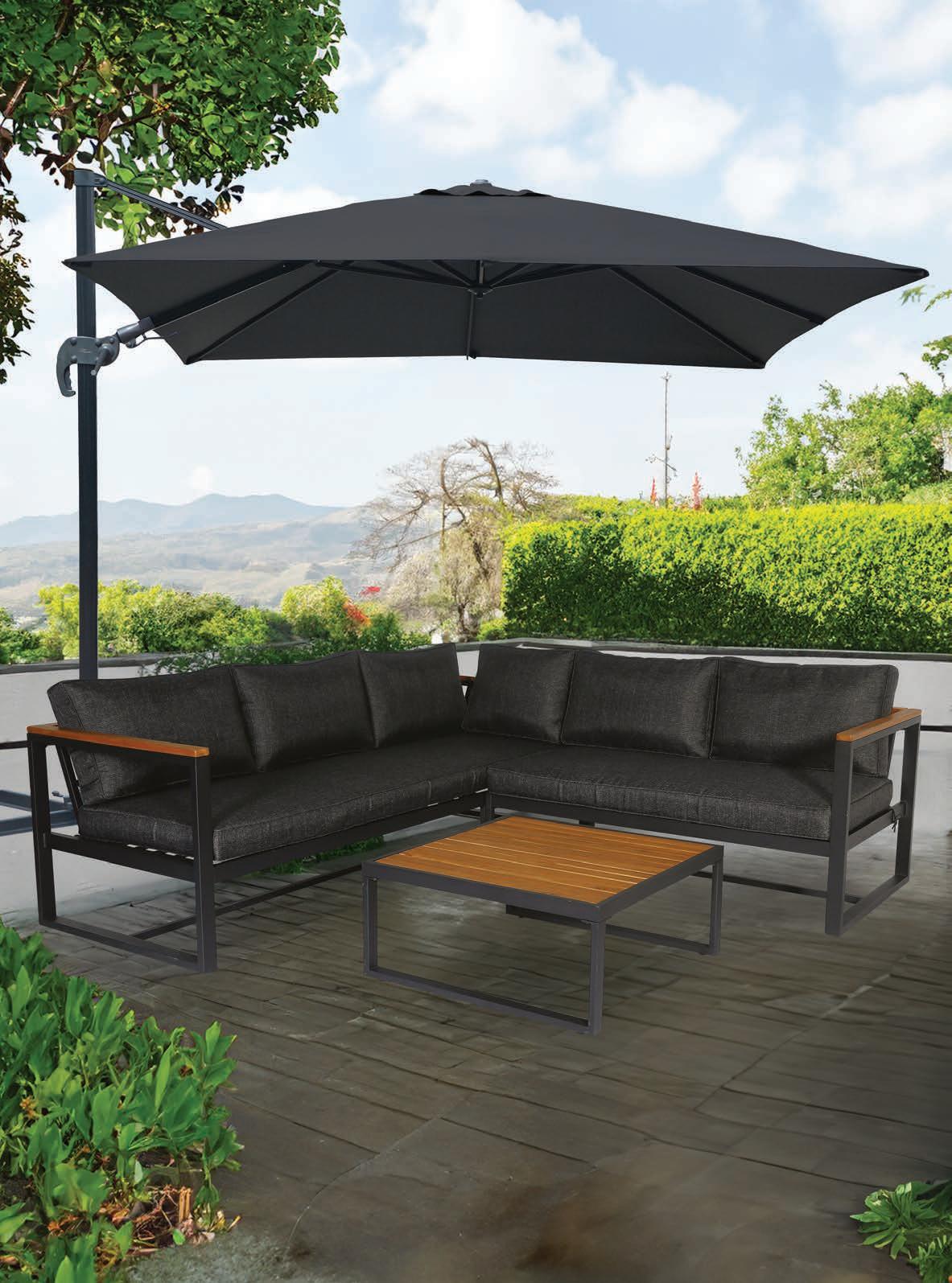ENSEMBLE LOUNGE ‘ADELAIDE’ Cadre en aluminium, carbon black / mystic grey. Canapé d’angle L240 x l240 x H72cm. Table basse L75 x l75 x H35cm. Hauteur d’assise 42 cm. Avec coussins imperméables 10cm. 680136/S SETPARASOL + PIED 90kg PARASOL ‘VOLTERRA’ 3 x 3M Mât en aluminium anodisé. Toile polyester 250g/m². 8 baleines en alu. Noir - 695276/S 439€ Anthracite - 695309/S 439€ 549€ GUIRLANDE 20 LED Ø3,8MM Warm white. 680252/D LANTERNE SOLAR MÉTAL Ø15,5 x H22cm. 680260/D €1495 Anthracite Noir 925€ PIED POUR PARASOL 90kg. 80 x 80 x 10cm. Sur roues. 695282/S 159€ €1695 AUTOROTATION 5 Meubles de jardin