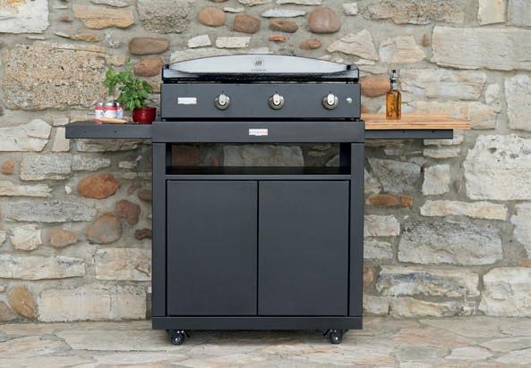 L133 x l57 x H115cm. Surface de cuisson 3 x (21 x 42cm). 3 grilles de cuisson en fonte. 3 brûleurs en inox. 11.4kW. Allumage électronique. Jusqu’à 10 personnes. 690846/D