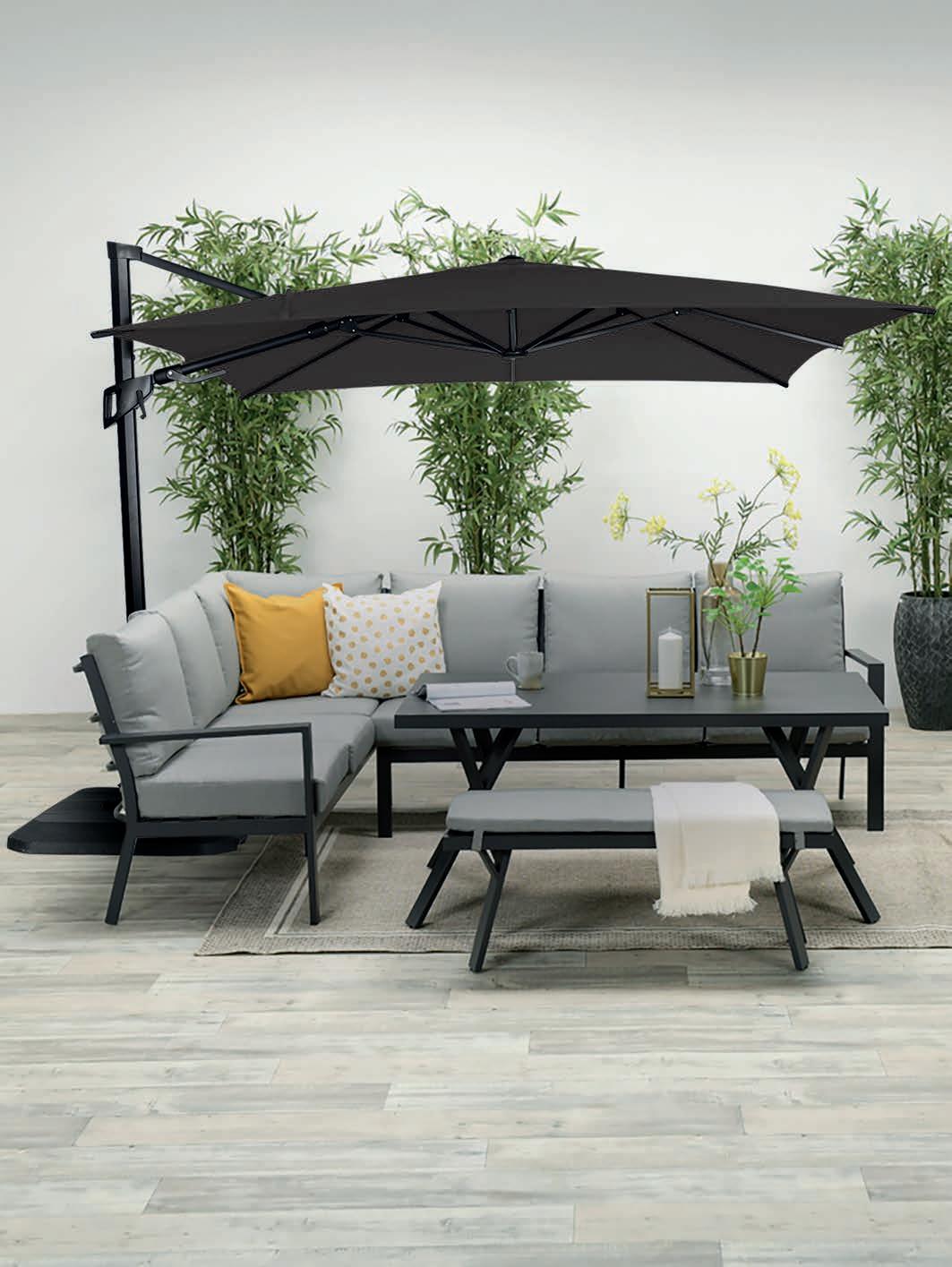 BANK ‘SERGIO’ L90 x B40 x H40cm. 680293/S 995€ LOUNGESET ‘SERGIO’ Aluminium frame, carbon black. Sofa rechts L186 x D76 x H85cm. Sofa links L277 x D76 x H85cm. Tafel L150 x B90 x H68cm. Bank in optie. Zithoogte 42,5cm. Met waterafstotende kussens 9,5cm. Bank in optie. 680294/S 549€ AUTOROTATIE PARASOL ‘NAXOS’ 3 x 3M + VOET 100KG Aluminium mast. Polyesterdoek 250g/m². 8 aluminium baleinen. Black/black. 694650/D 195€ VUURHAARD ‘BILBAO’ Verschillende kleuren. Zeskant. 680298/D €4995 /stuk 2