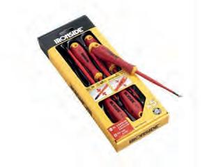 Houtbeitels van 6-10-12-18-26-32mm. Blad uit verchroomd manganees staal. Bi-compo handgreep. In houten doos. DIN 5139.