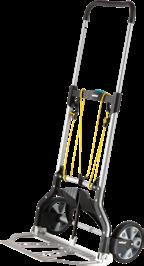 Léger et compact • Equipé d'une poignée gainée escamotable en un clic sur simple bouton-pression • Muni de grandes roues profilées et bascule facilement par traverse • Fixation maligne en 3 points • Dim. déplié: 54 x 110 x 47 cm • Dim. plié: 54 x 82 x 7,7 cm • Max. 100 kg • Garantie 10 ans 061668/D