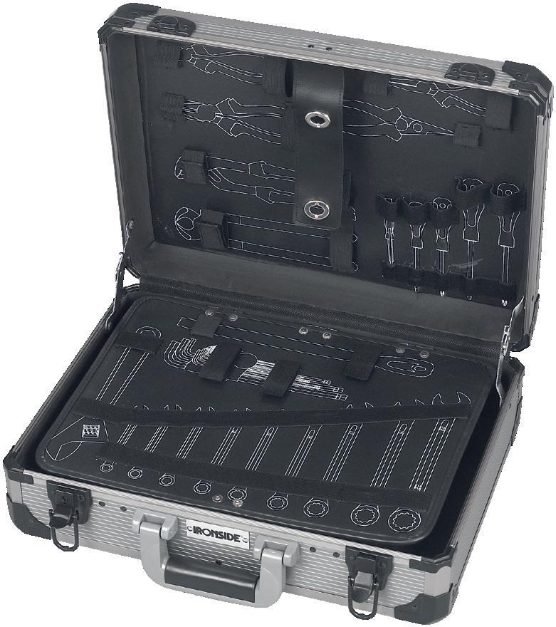 Vakken op de bodem en een gereedschapshouder. 2 sloten met sleutels. Aluminium buitenwand met verstevigde hoeken. Afm. 450 x 330 x 145mm. Leeg. 390240/S