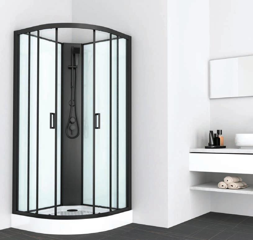 l90 x L90 x H225cm. Quart de rond. Accès d’angle. 2 portes coulissantes. Verres transparents trempés. Portes 5 mm. Parois fies 4mm. Paroi de fond 4 mm coloris noir. Profilé alu chromés très plats. oignée ABS chromé. Panneau de commande en acier inoxydable avec mitigeur sélecteur mécanique et jets hydromassants. Douchette à main 3 fonctions. Tête de douche en inox 25 x 25 cm intégrée dans le toit blanc en ABS. Flexible 1,50m. Roulettes doubles plastique. Receveur en acrylique renforcé 90 x 90 x 14 cm. Bonde 90 mm. Installation facile avec système de clips. Pas de vis. Pas de forage. Sans silicone. - 481080/D