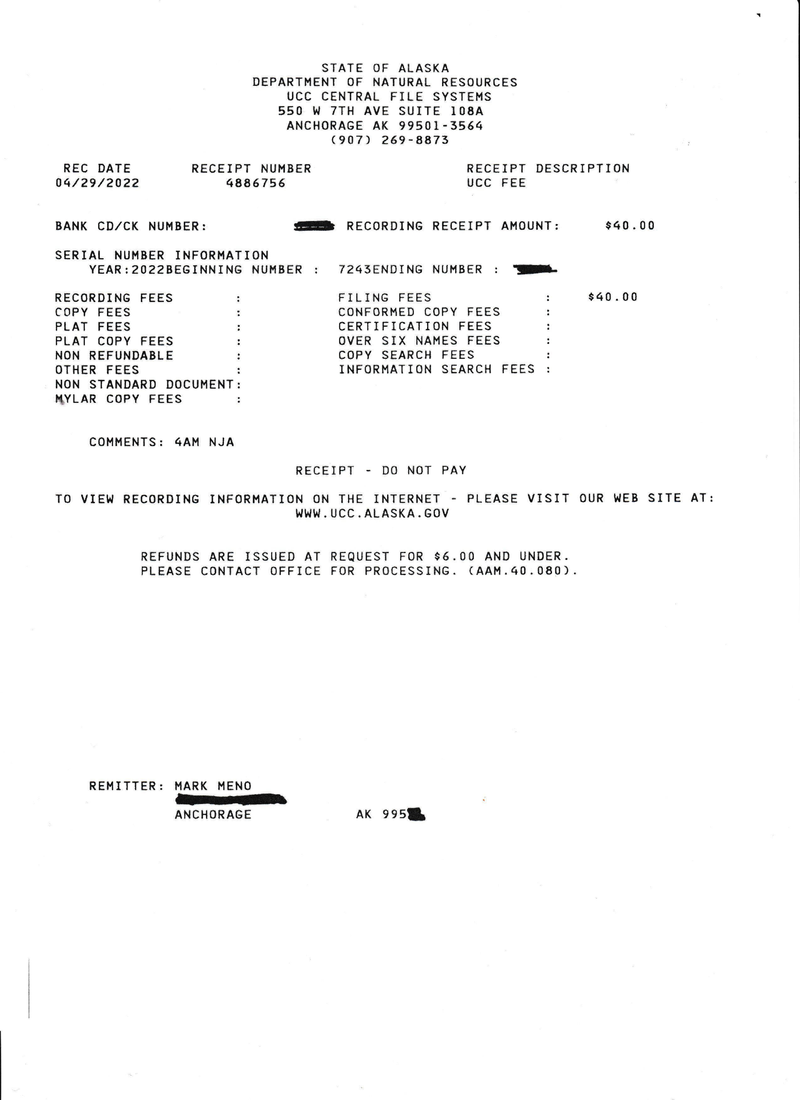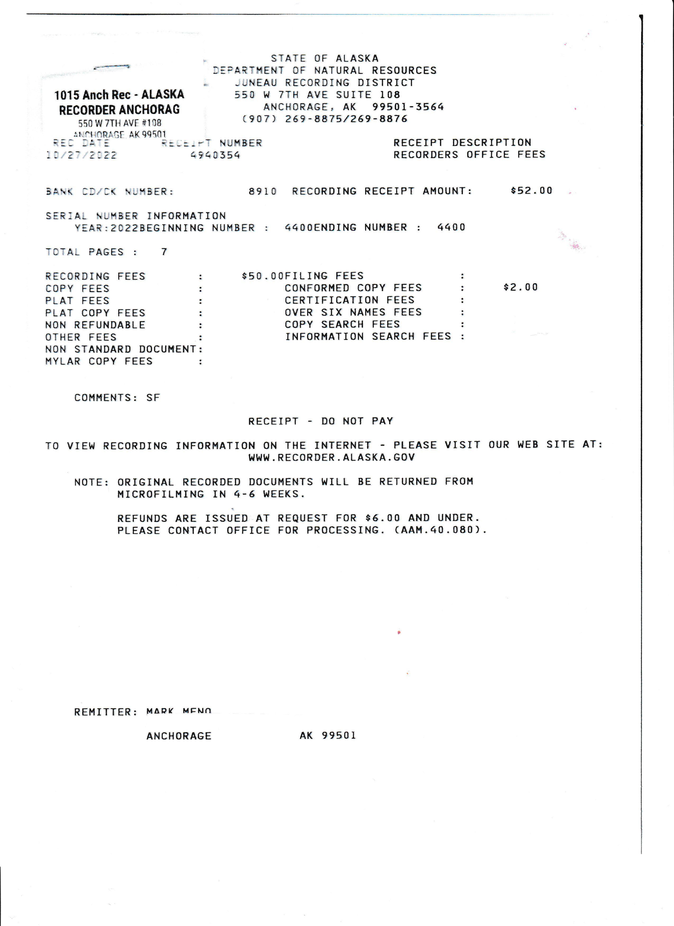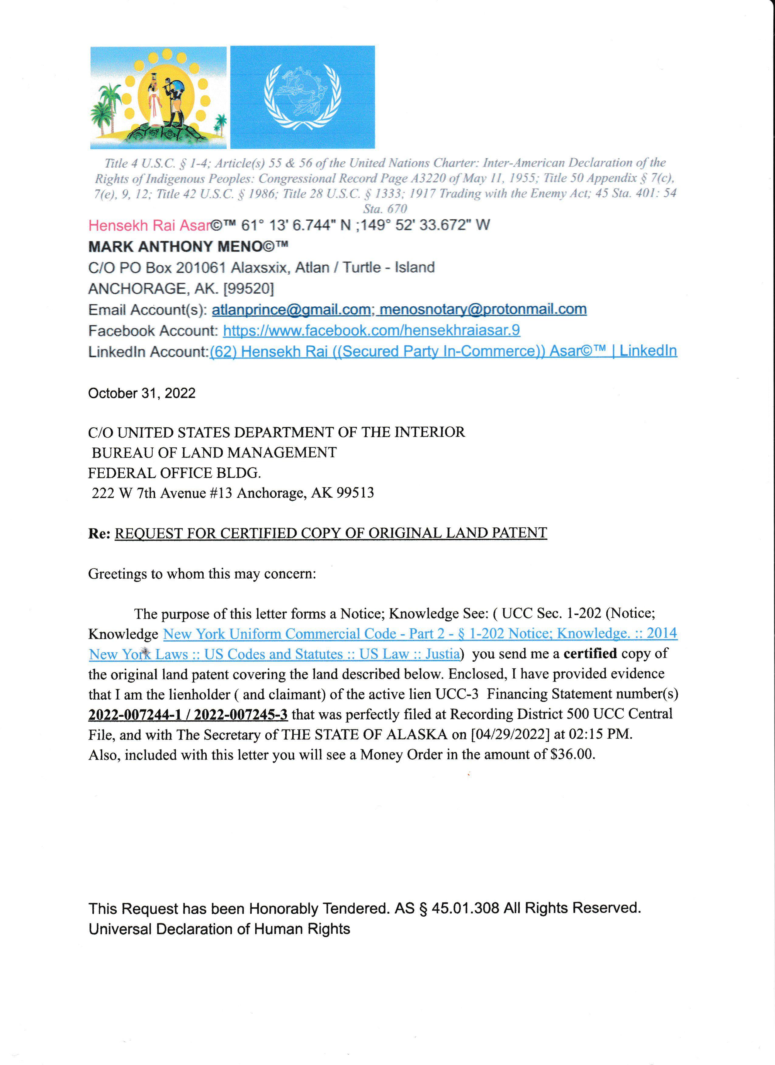 REQUEST FOR CERTIFIED COPY OF ORIGINAL LAND PATENT MAILED TO US DEPT OF INTERIOR BLM FEDERAL OFFICE