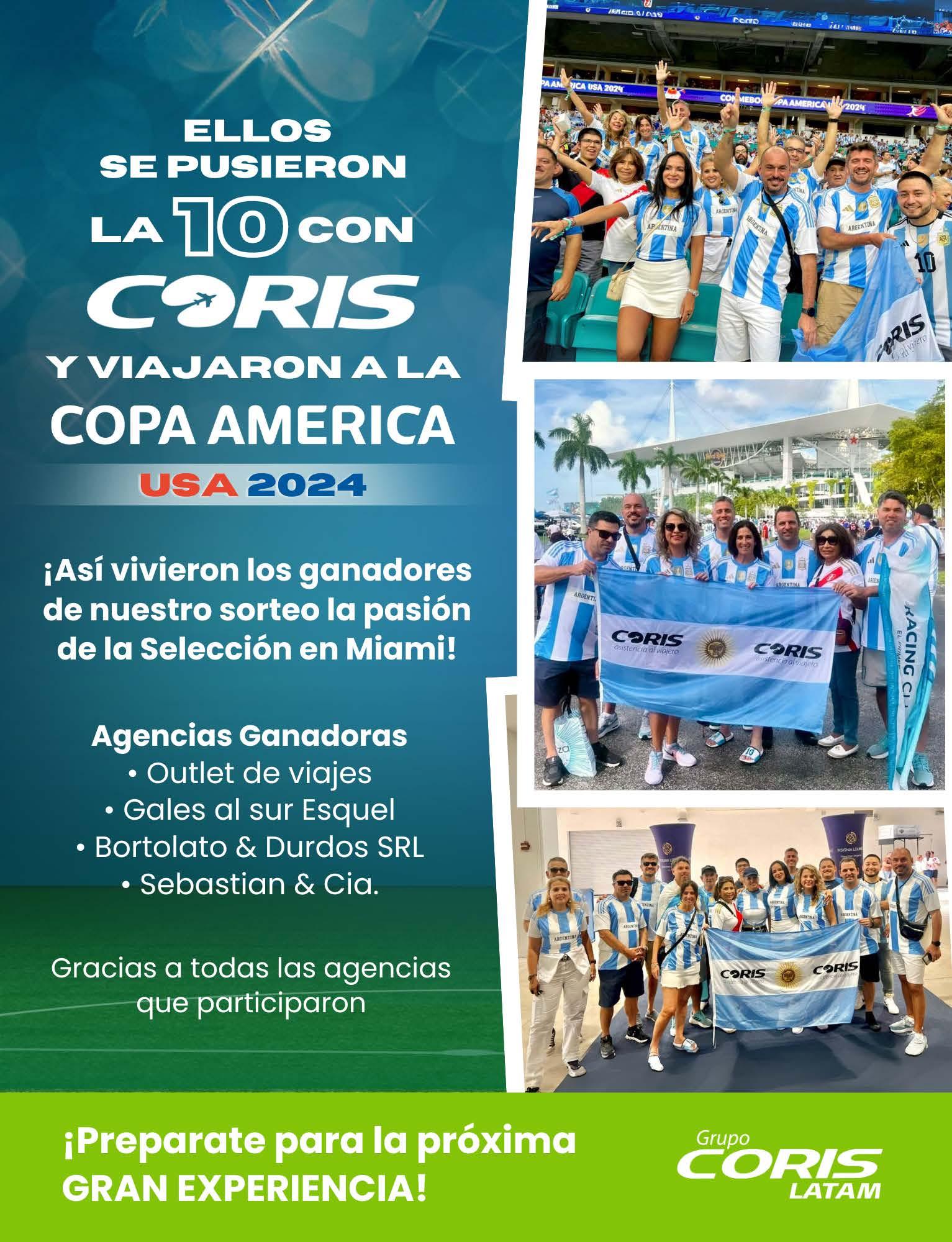 actual selección campeona del mundo y celebrar el triunfo 2-0, gritando cada gol y cerrando con un broche de oro la fase de grupos. Luego del partido siguieron disfrutando de la excelente comida y bebida del lugar. Esta iniciativa no solo reforzó el compromiso continuo de Coris con más de 2,500 agencias de viaje aliadas en Argentina, sino que también fortaleció significativamente la colaboración mutua. A lo largo de más de 25 años, Coris sigue consolidando y fortaleciendo su vínculo con el canal, implementando acciones específicas cada año para favorecer y respaldar activamente a las agencias aliadas. Pronto revelarán más detalles acerca de la próxima gran experiencia que están preparando para su principal canal de ventas.