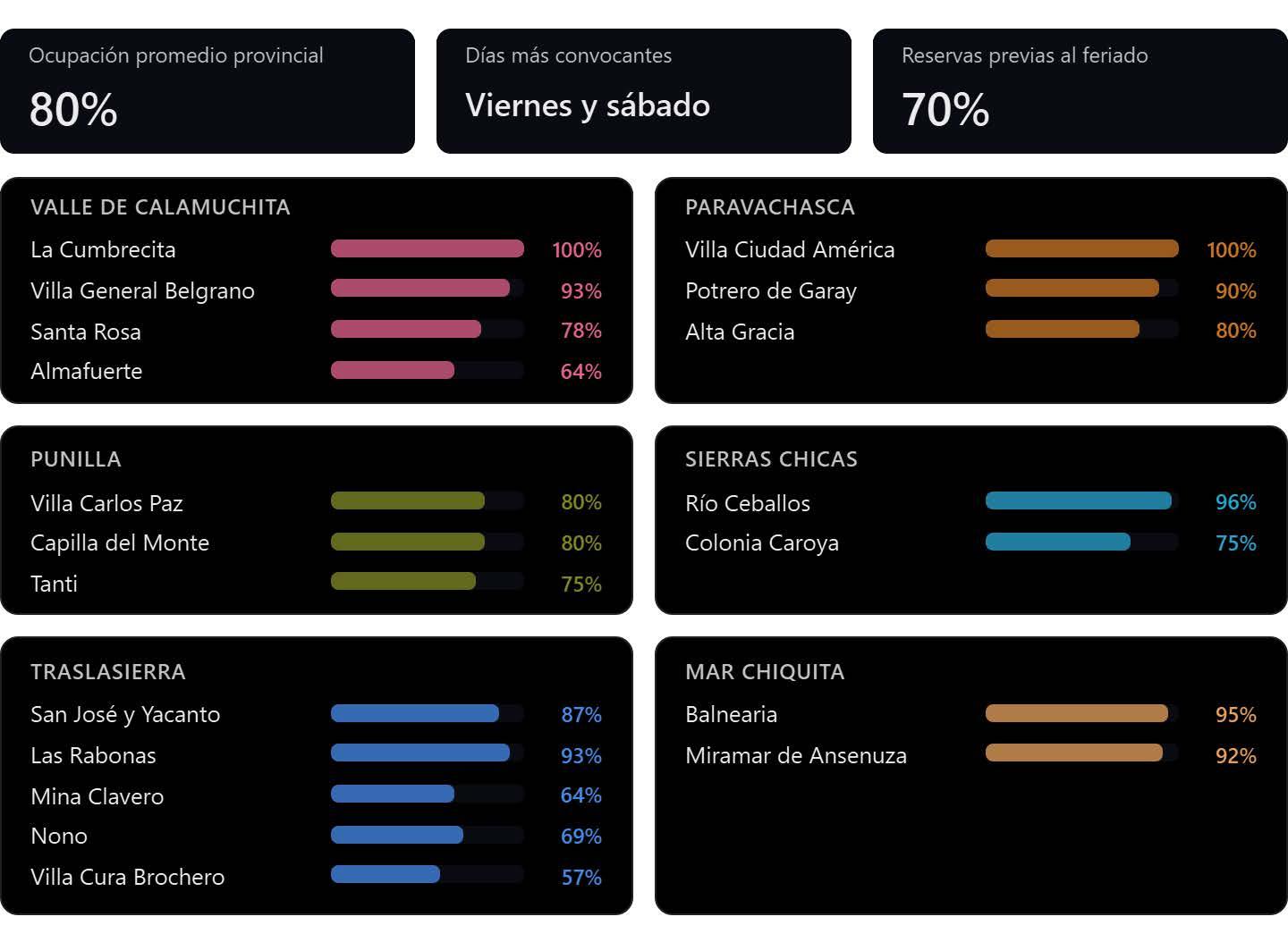En Punilla, Villa Carlos Paz y Capilla del Monte marcaron 80% —con picos del 86% en establecimientos categorizados en la primera— mientras Tanti cerró en 75%. En Sierras Chicas, Río Ceballos fue uno de los grandes protagonistas con un 96% de ocupación,