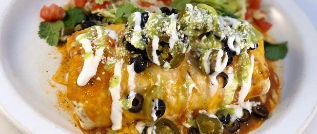 Giant flour tortilla stuffed with rice, beans and your choice of shredded beef, chicken or ground beef. Topped with red or green sauce and melted cheese, lettuce, tomatoes, black olives, jalapenos and drizzle of sour cream and guacamole sauce. 19.99
