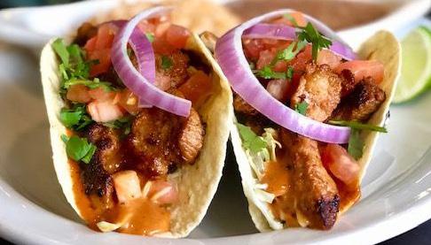 Baja style fish tacos, made with crusted, breaded tilapia, topped with lettuce, cilantro, tomatoes and garlic lime dressing in fresh fiesta blended flour/corn tortillas. Garlic lime dressing on the side. 17.99