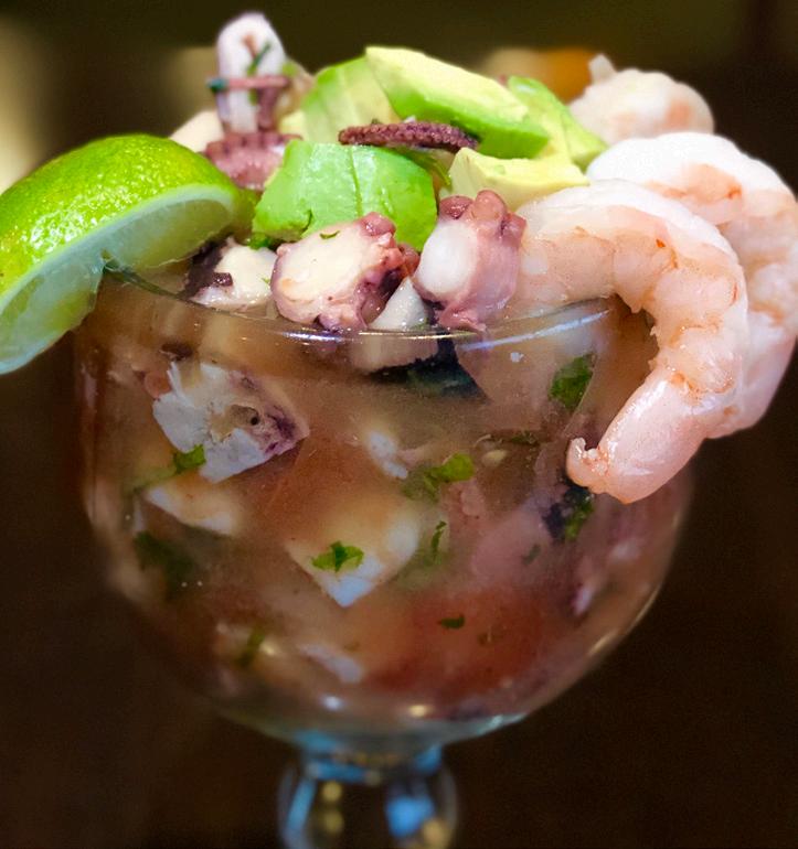 Fresh diced octopus and jumbo shrimp in a seafood broth with cilantro, tomatoes, onions and fresh avocados. Served in a jumbo glass - hot, warm or cold. 23.99