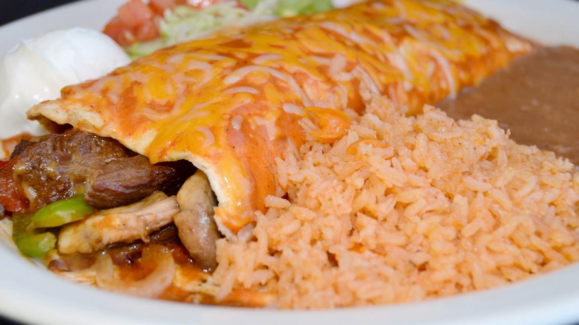 Grilled steak, chicken or marinated pork adobada mixed with mushrooms, onions and red and green bell peppers rolled in a flour tortilla and covered in our tasty hatch chili sauce and melted jack cheese. Served with rice and beans. 17.99