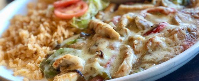Succulent shrimp sautéed with diced tomato. Avocado slices layered on top covered with creamy seafood sauce and melted jack cheese. Topped off with Fiesta’s roasted corn salsa. Served with rice and beans. 21.99
