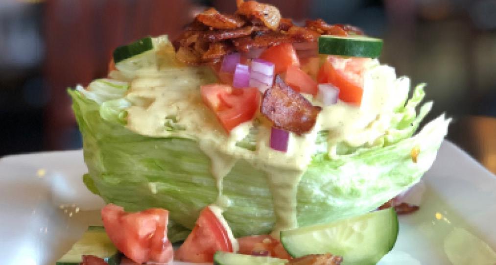 Iceberg lettuce quartered and topped with crispy bacon, cucumbers, tomatoes, red onion and cilantro drizzled with poblano avocado ranch dressing and sprinkled with cotija cheese. 12.59