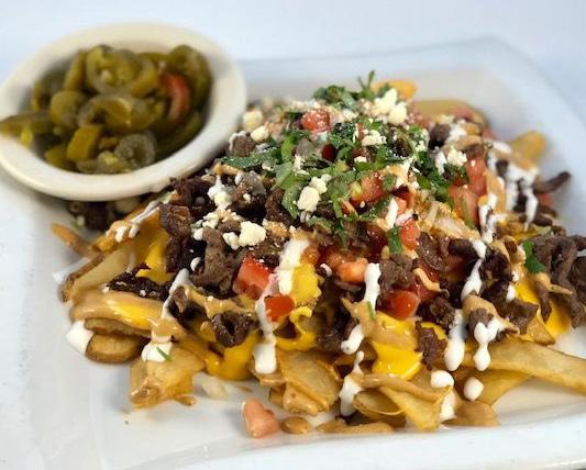 Melted cheddar and nacho cheese over steak fries then topped with grilled steak , tomato, cilantro, onions, and jalapeños then served with a side of creamy chipotle sauce. 15.99
