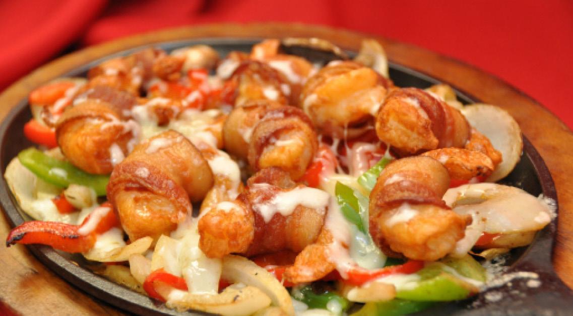 Bacon wrapped shrimp with melted jack cheese, served over sautéed bell peppers, mushrooms and onions. Served with sour cream, guacamole, rice and beans. 23.99