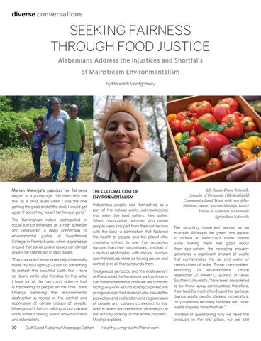 left: Susan Diane Mitchell, founder of Dynamite Hill-Smithfield Community Land Trust, with two of her children; center: Marian Mwenja, Justice Fellow at Alabama Sustainable Agriculture Network; The recycling movement serves as an example. Although the green bins appear to reduce an individual’s waste stream while making them feel good about their eco-action, the recycling industry generates a significant amount of waste that contaminates the air and water of communities of color. Those communities, according to environmental justice researcher Dr. Robert D. Bullard, at Texas Southern University, “have been considered to be throw-away communities; therefore, their land [is most often] used for garbage dumps, waste transfer stations, incinerators, dirty materials recovery facilities and other waste disposal infrastructure.” “Instead of questioning why we need the products in the first place, we are still