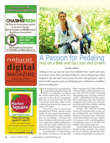 bike to work grew by 43 percent between 2000 and 2008, a statistic that doesn’t surprise Blue. She first tried bike commuting after growing weary of relying on the bus system. “I got hooked on just how good it felt. It’s like flying.” Blue soon found that cycling was also a faster way to commute, restoring control of her schedule, reducing stress and boosting her happiness. Strobel, who adds that enjoying nature and increasing daily exercise are also cycling benefits, says it’s bolstered her happiness and quality of life. “I don’t have to spend time going to the gym,” explains the freelance writer and photographer. “I’m getting my exercise on my bike. I feel healthier and in better shape now.” Several studies show dramatic health benefits for bike commuters. The Archives of Internal Medicine reported that when University of Copenhagen researchers ana-
