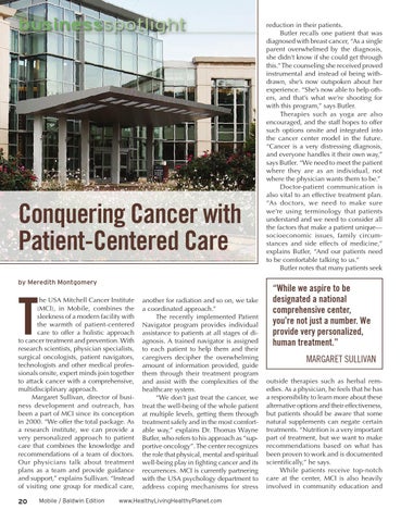 .he USA Mitchell Cancer Institute (MCI), in Mobile, combines the sleekness of a modern facility with the warmth of patient-centered care to offer a holistic approach to cancer treatment and prevention. With research scientists, physician specialists, surgical oncologists, patient navigators, technologists and other medical professionals onsite, expert minds join together to attack cancer with a comprehensive, multidisciplinary approach. Margaret Sullivan, director of business development and outreach, has been a part of MCI since its conception in 2000. “We offer the total package. As a research institute, we can provide a very personalized approach to patient care that combines the knowledge and recommendations of a team of doctors. Our physicians talk about treatment plans as a team and provide guidance and support,” explains Sullivan. “Instead of visiting one group for medical care,