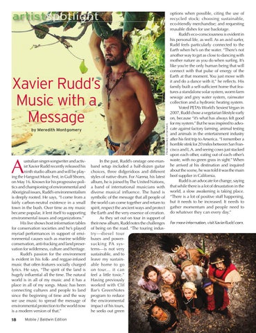 options when possible, citing the use of recycled stock; choosing sustainable, eco-friendly merchandise; and requesting reusable dishes for use backstage. Rudd’s eco-consciousness is evident in his personal life, as well. As an avid surfer, Rudd feels particularly connected to the Earth when he’s on the water. “There’s not another way to get as close to dancing with mother nature as you do when surfing. It’s like you’re the only human being that will connect with that pulse of energy of the Earth at that moment. You just move with it and do a dance with it,” he reflects. His family built a self-sufficient home that features a standalone solar system, worm farm sewage and grey water system, rainwater collection and a hydronic heating system. Voted PETA’s World’s Sexiest Vegan in 2007, Rudd chose a vegetarian lifestyle early on, because “it’s what has always felt good for my system.” But he was inspired to advocate against factory farming, animal testing and animals in the entertainment industry after his first trip to America. “I remember a horrible stink for 20 miles between San Francisco and L.A. and seeing cows just stacked upon each other, eating out of each other’s waste, with no green grass in sight.” When he arrived at his destination and inquired about the scene, he was told it was the main beef supplier in California. Rudd is an advocate for change, saying that while there is a lot of devastation in the world, a slow awakening is taking place. “There is a lot of positive stuff happening, but it needs to be increased. It needs to gather momentum and people need to do whatever they can every day.” For more information, visit XavierRudd.com.