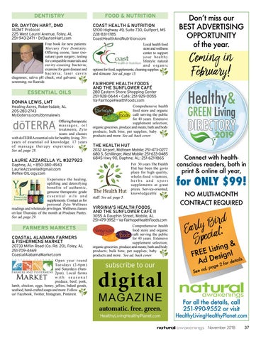 Healing Acres, Robertsdale, AL 205-283-2743 MyDoterra.com/donnalewis Offering therapeutic massages, oil treatments, Zyto scans and classes with doTERRA essential oils for healthy living. 20+ years of essential oil knowledge. 17 years of massage therapy experience. See ad, page 28.