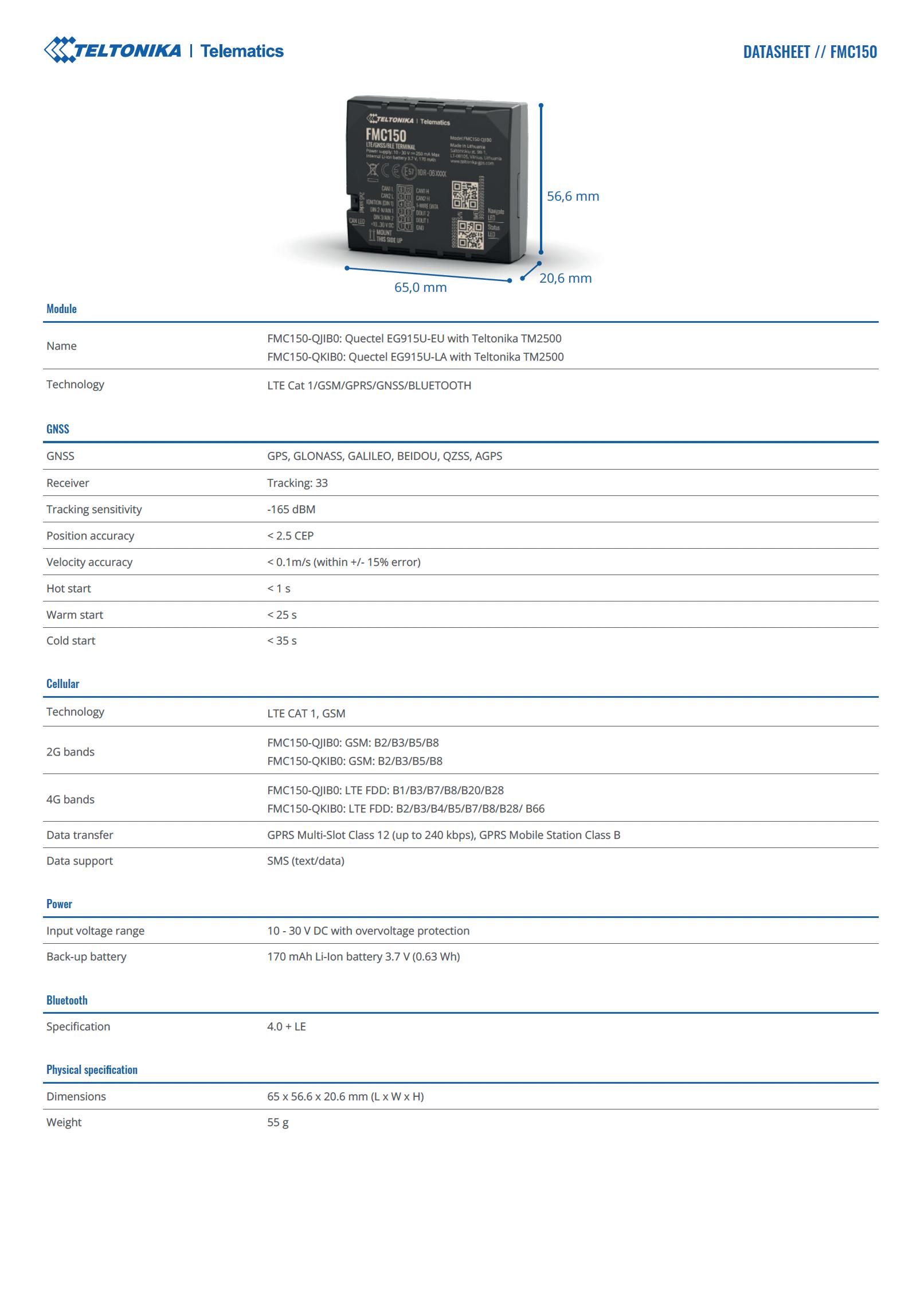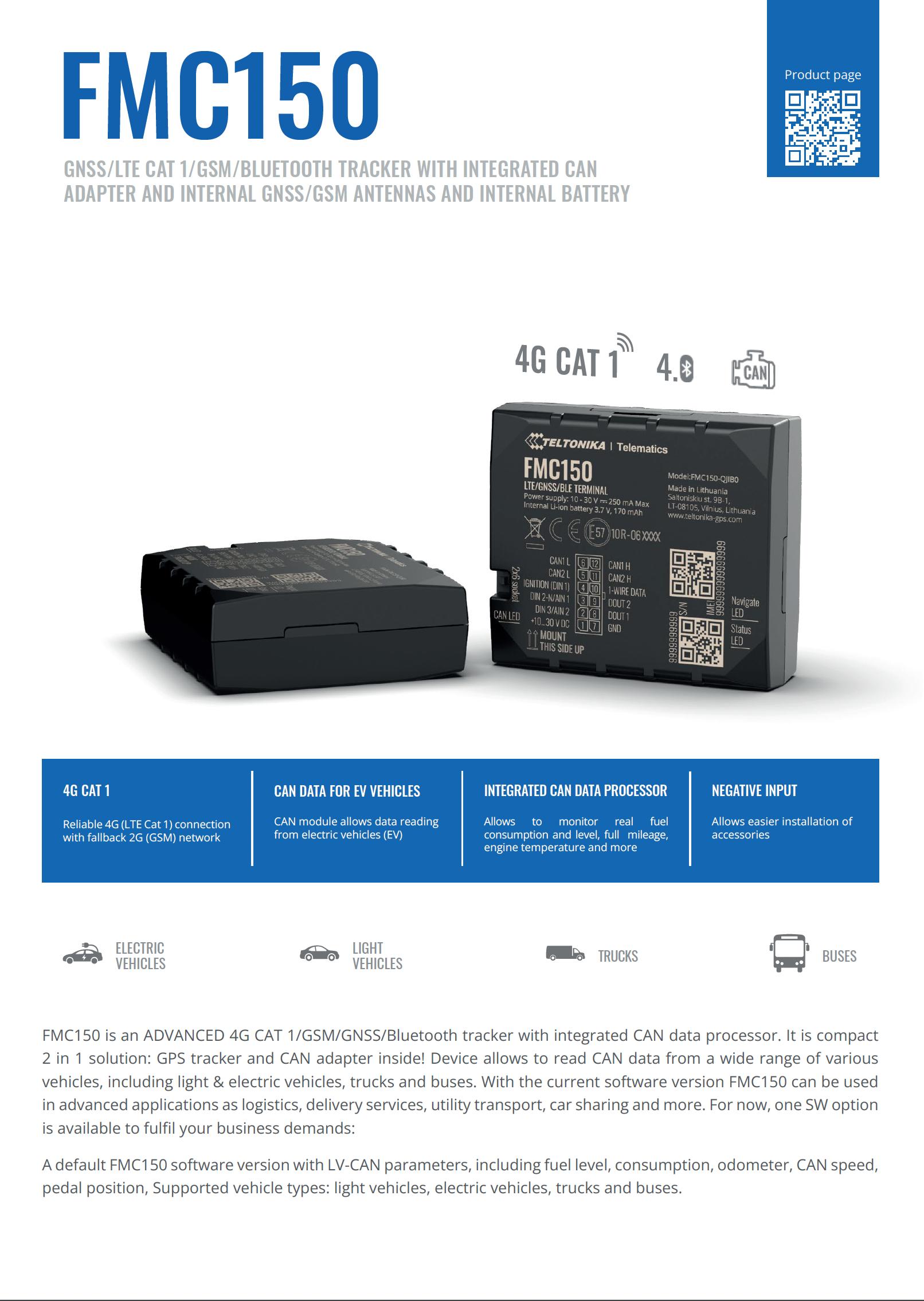 El FMC150 es un rastreador 4G CAT 1/GSM/GNSS/Bluetooth AVANZADO con procesador de datos CAN integrado. Es una solución compacta 2 en 1: rastreador GPS y adaptador CAN en su interior. El dispositivo permite leer datos CAN de una amplia gama de vehículos, incluidos vehículos ligeros y eléctricos, camiones y autobuses. Con la versión actual del software, el FMC150 se puede utilizar en aplicaciones avanzadas como logística, servicios de entrega, transporte de servicios públicos, uso compartido de automóviles y más.