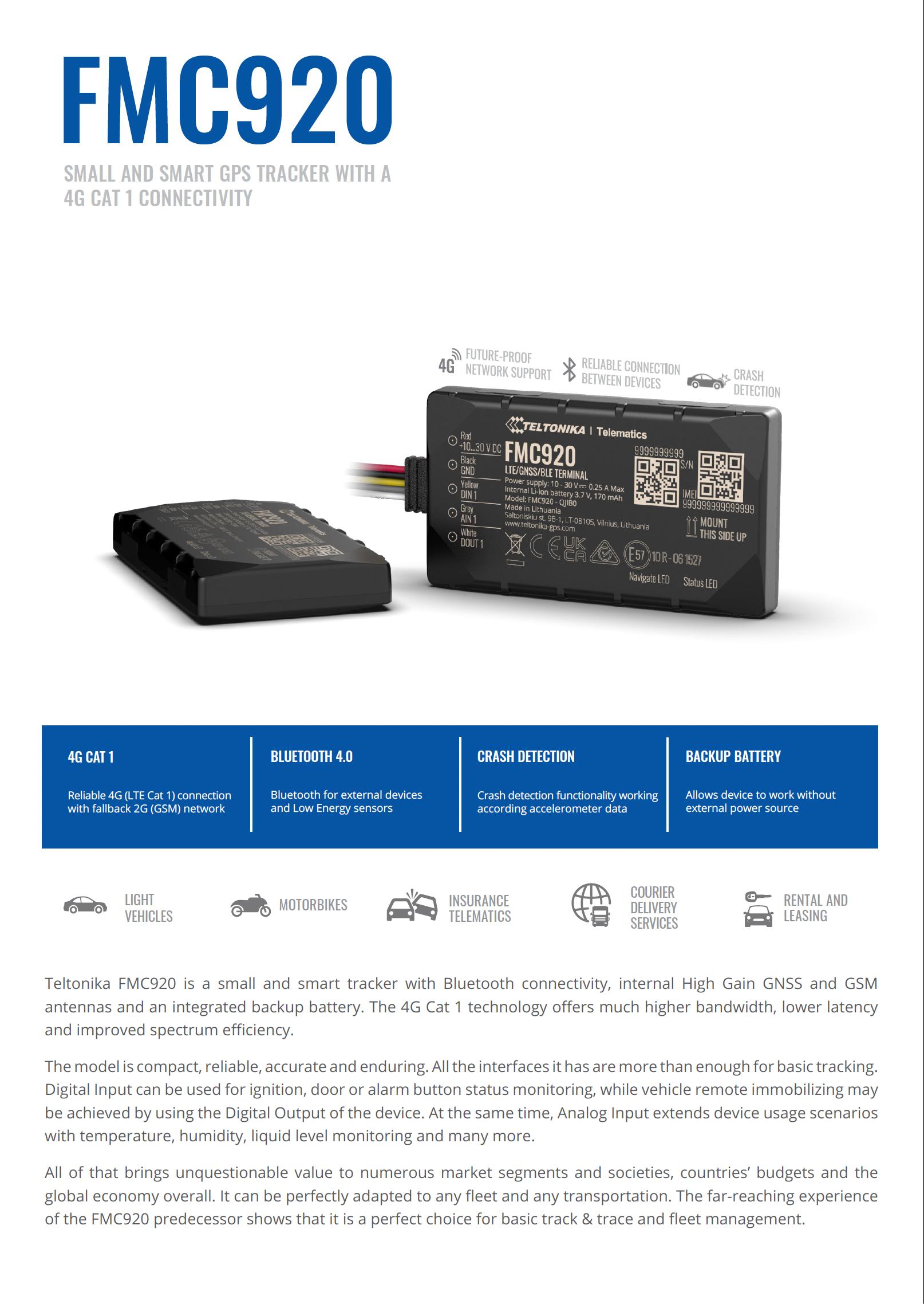 Teltonika FMC920 es un rastreador pequeño e inteligente con conectividad Bluetooth, antenas GNSS y GSM internas de alta ganancia y una batería de respaldo integrada. La tecnología 4G Cat 1 ofrece un ancho de banda mucho mayor, una latencia menor y una eficiencia espectral mejorada.