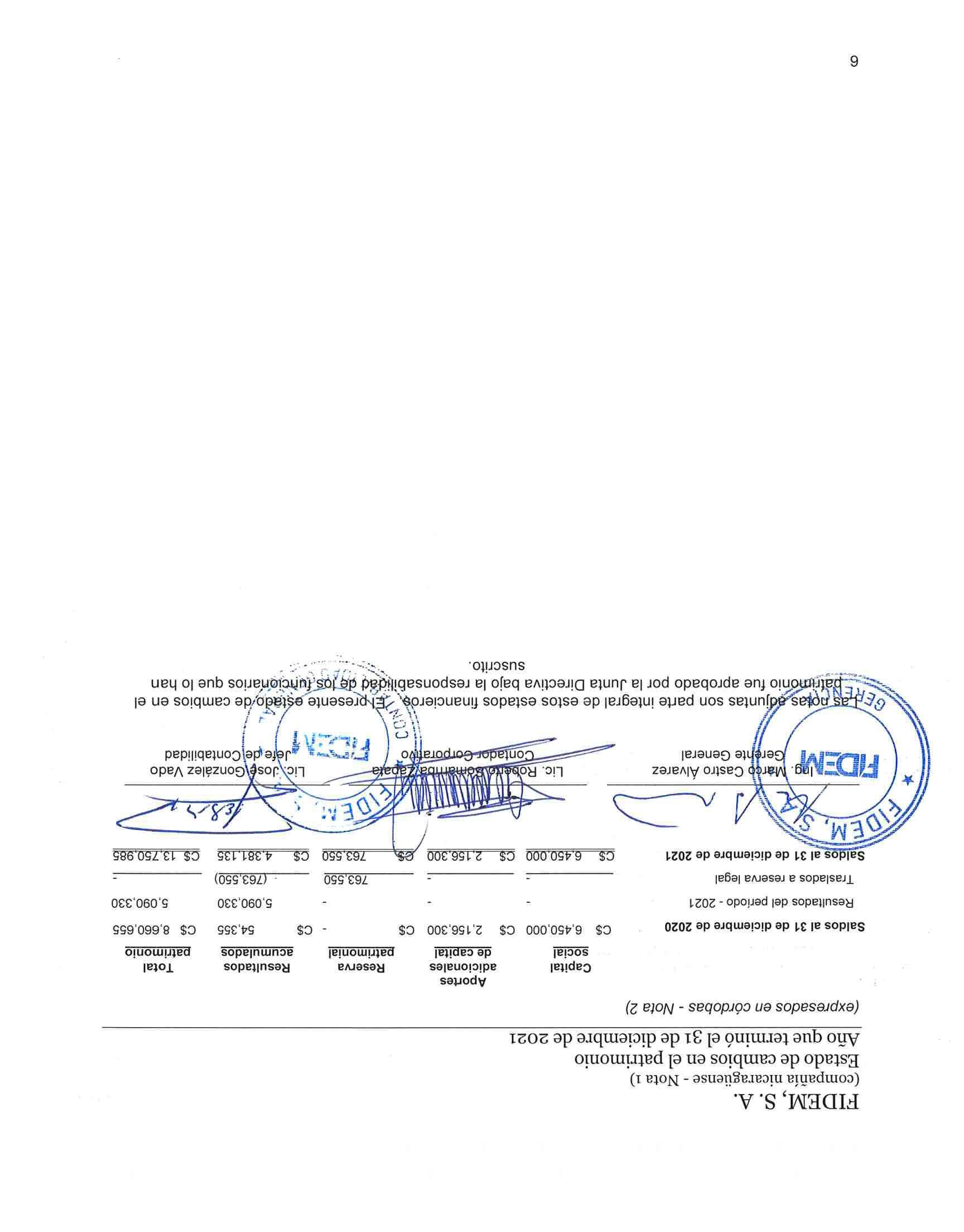 Saldos según libros antes de ajustes y reclasificaciones Ajustes y reclasificaciones Saldos auditados al 31 de diciembre de 2021 Activos Efectivo y equivalentes de efectivo C$ 7,215,536 C$ - C$ 7,215,536 Cartera de créditos 124,325,803 - 124,325,803 Otras cuentas por cobrar, neto 367,936 - 367,936 Mobiliario y equipo 212,598 - 212,598 Otros activos 13,995,152 - 13,995,152 Total activos C$ 146,117,025 C$ - C$ 146,117,025 Pasivos Obligaciones con instituciones financieras y por otros financiamientos 112,198,851 - 112,198,851 Otras cuentas por pagar 19,680,006 - 19,680,006 Provisiones 487,183 - 487,183 Total pasivos 132,366,040 - 132,366,040 Patrimonio Capital social 6,450,000 - 6,450,000 Aportes adicionales de capital 2,156,300 - 2,156,300 Reservas patrimoniales 763,550 - 763,550 Resultados acumulados 4,381,135 - 4,381,135 Total patrimonio 13,750,985 - 13,750,985 Total pasivos y patrimonio C$ 146,117,025 C$ - C$ 146,117,025 Cuentas de orden C$ 151,894,181 C$ - C$ 151,894,181