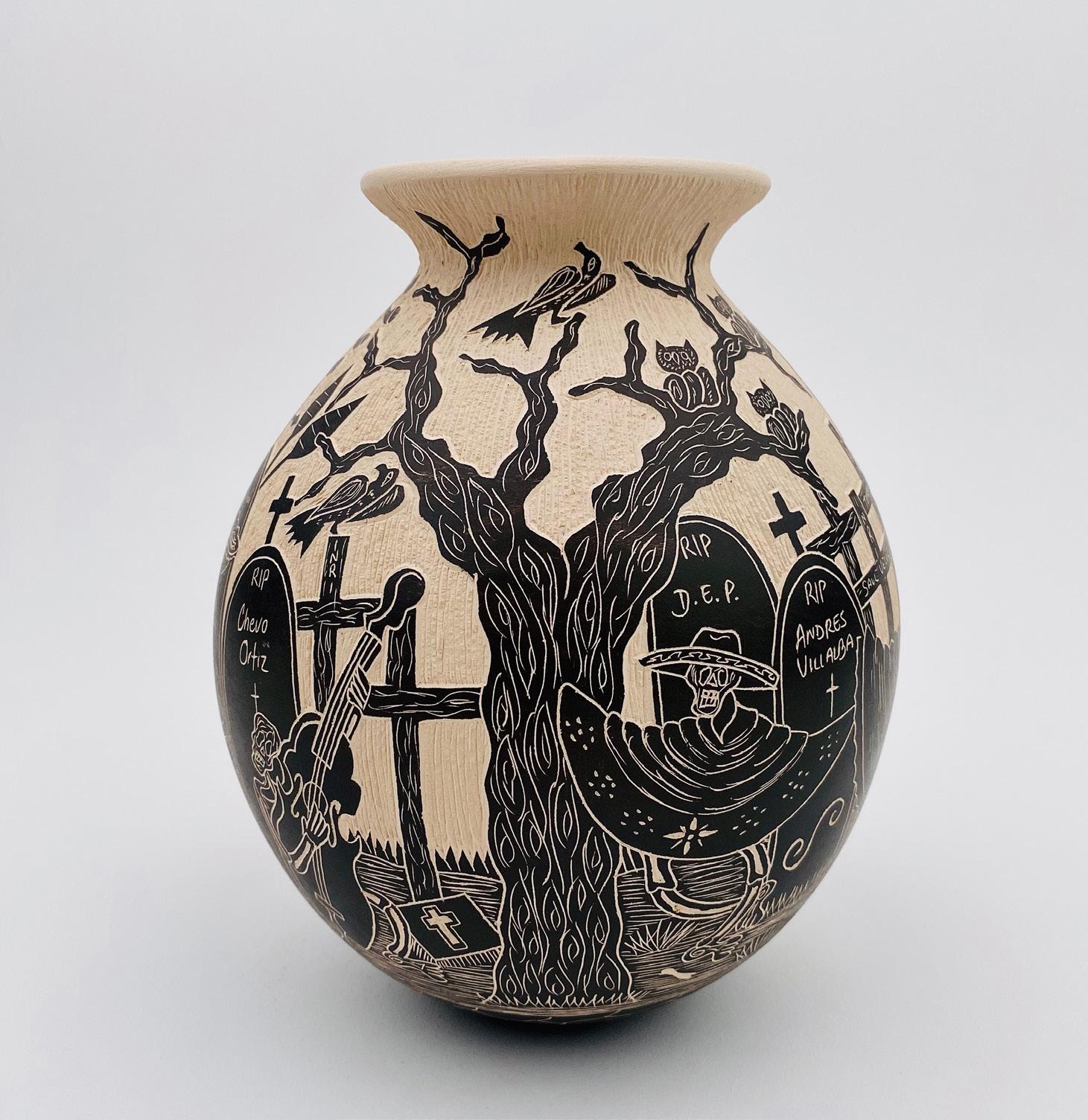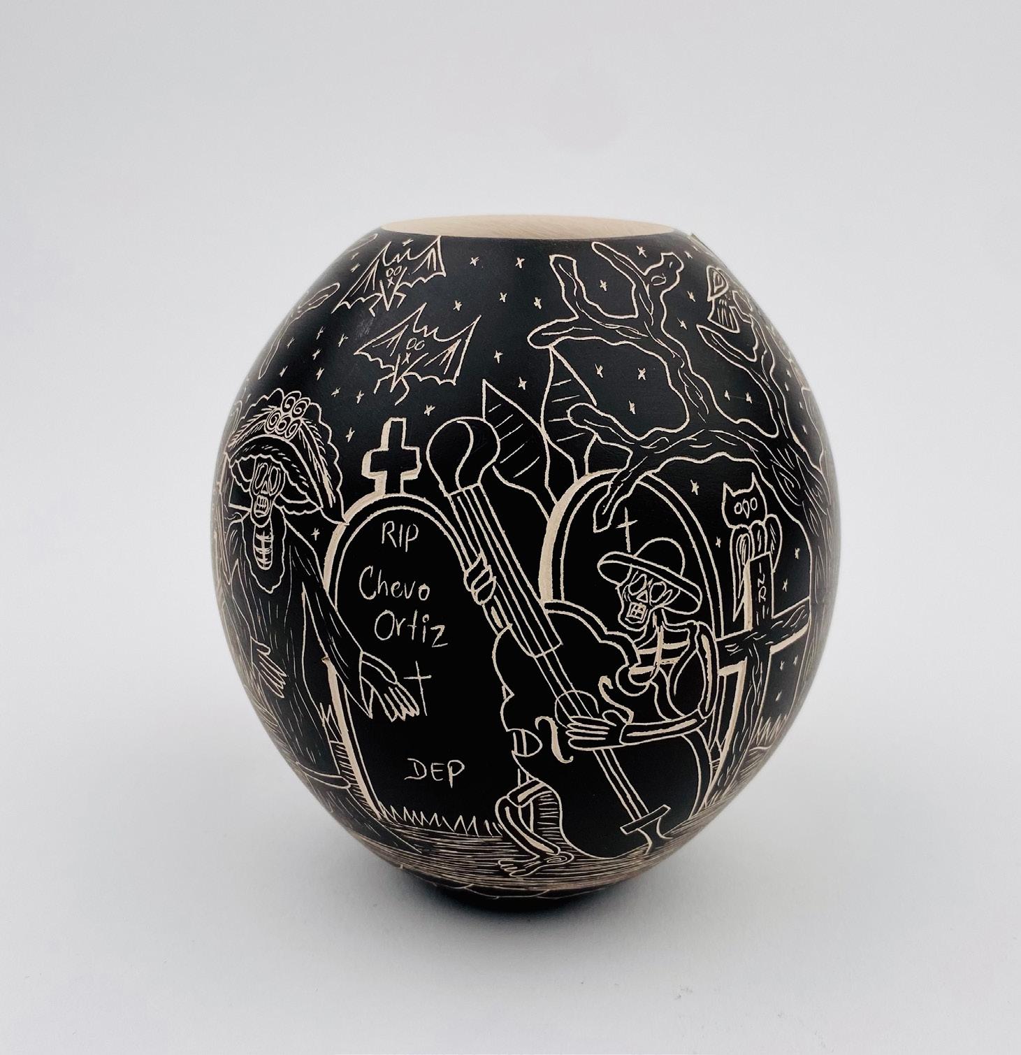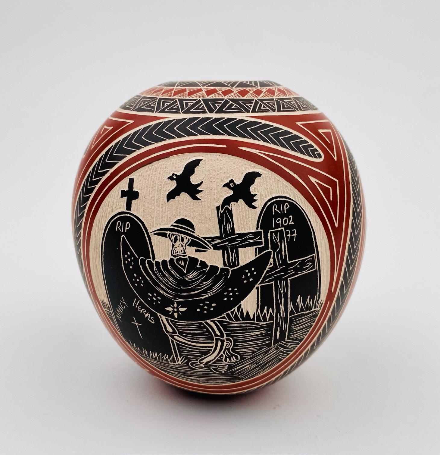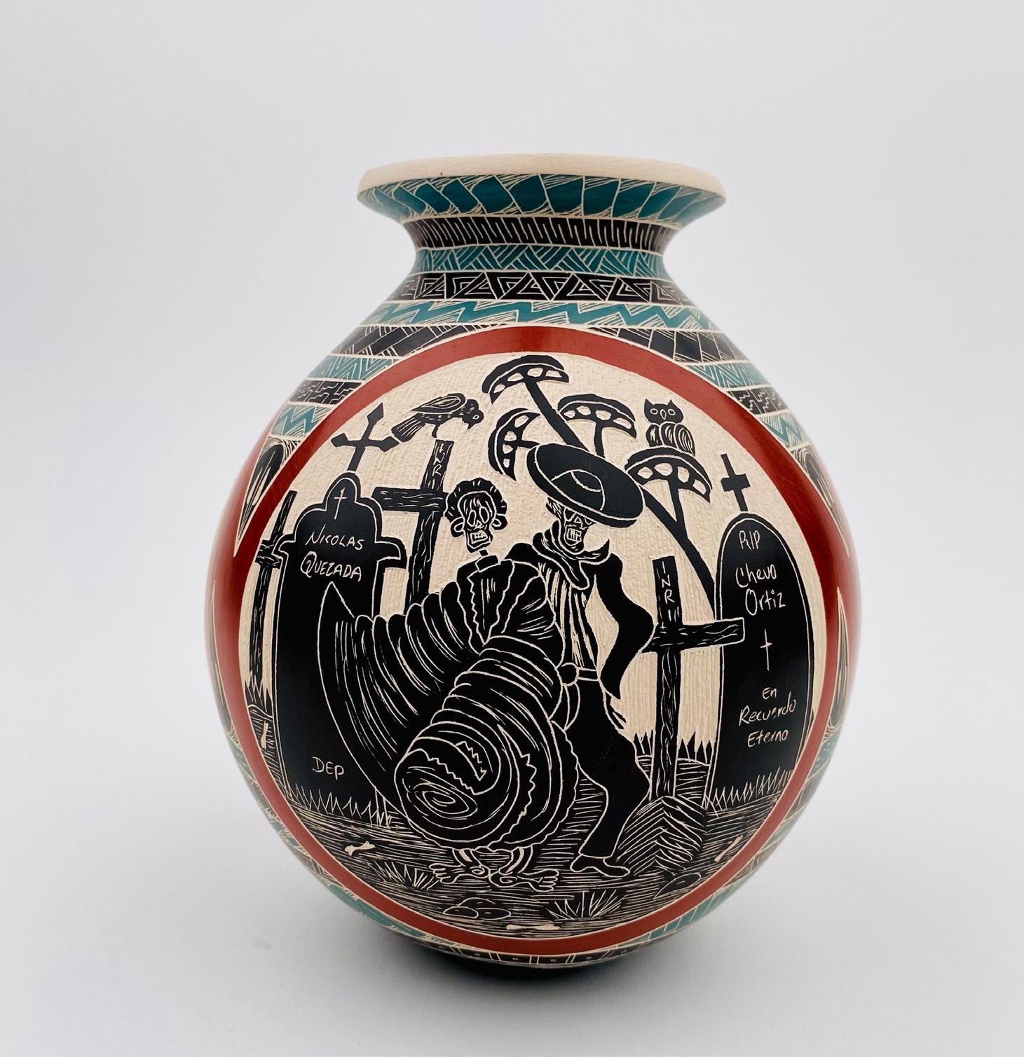 Hilario Quezada is a potter from Mata Ortiz, Chihuahua, Mexico. Quezada has been producing a lot of black and white sgraffito pieces related with Day of the Dead and Night of the Dead on his pots, besides to his contemporary black-on-beige painted designs.