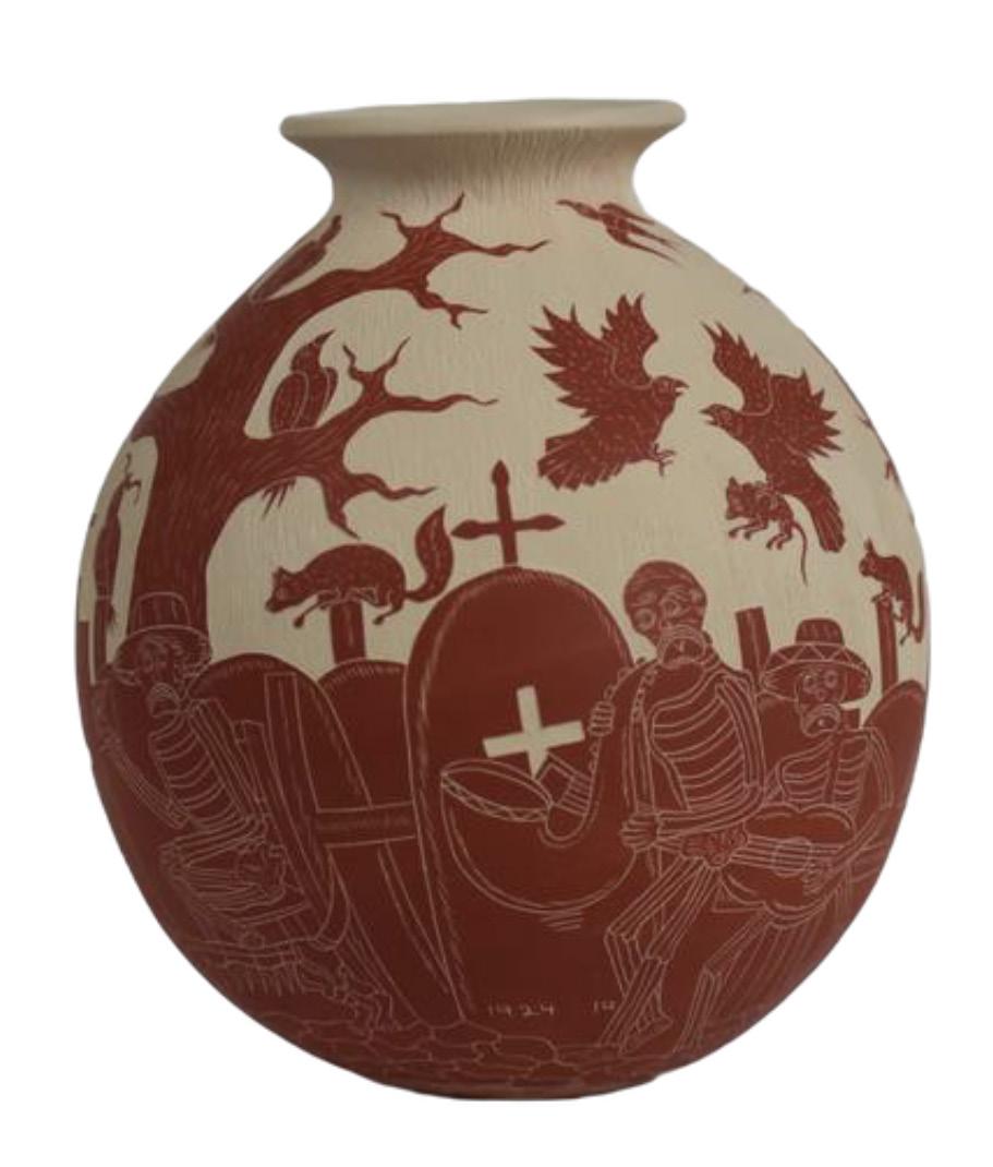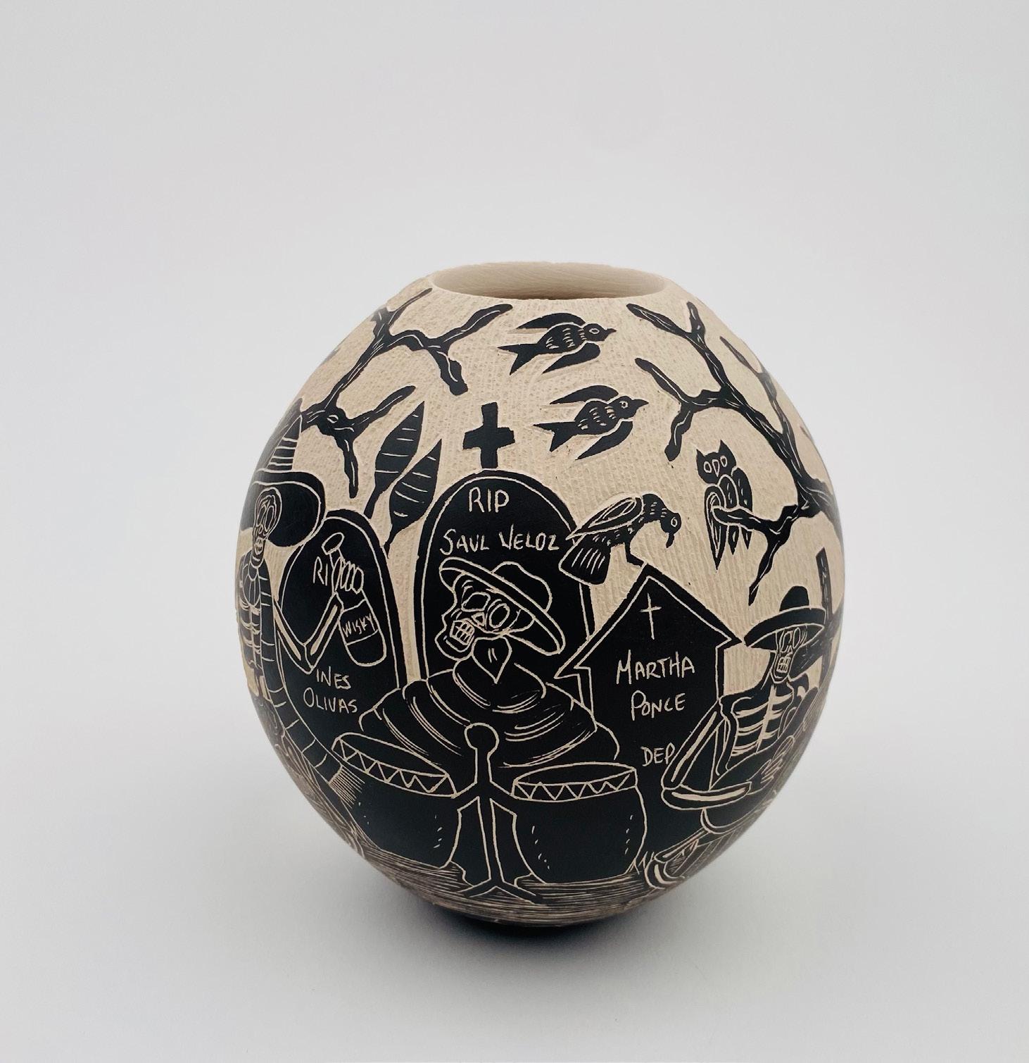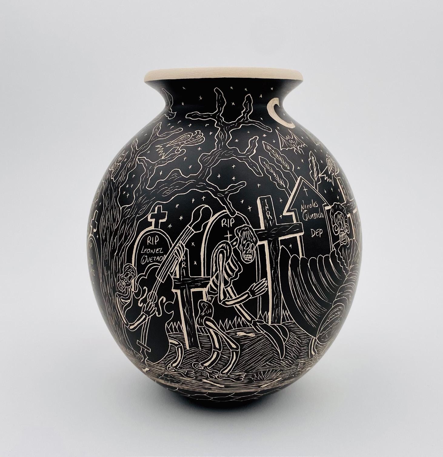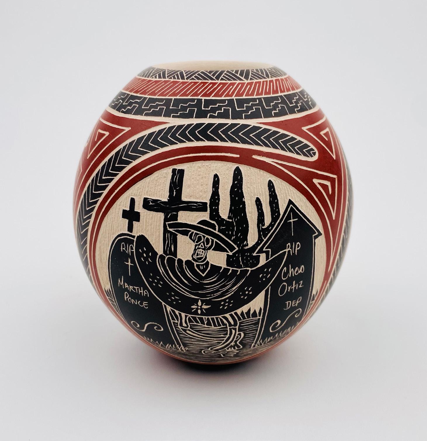 Hilario Quezada is a potter from Mata Ortiz, Chihuahua, Mexico. Quezada has been producing a lot of black and white sgraffito pieces related with Day of the Dead and Night of the Dead on his pots, besides to his contemporary black-on-beige painted designs.