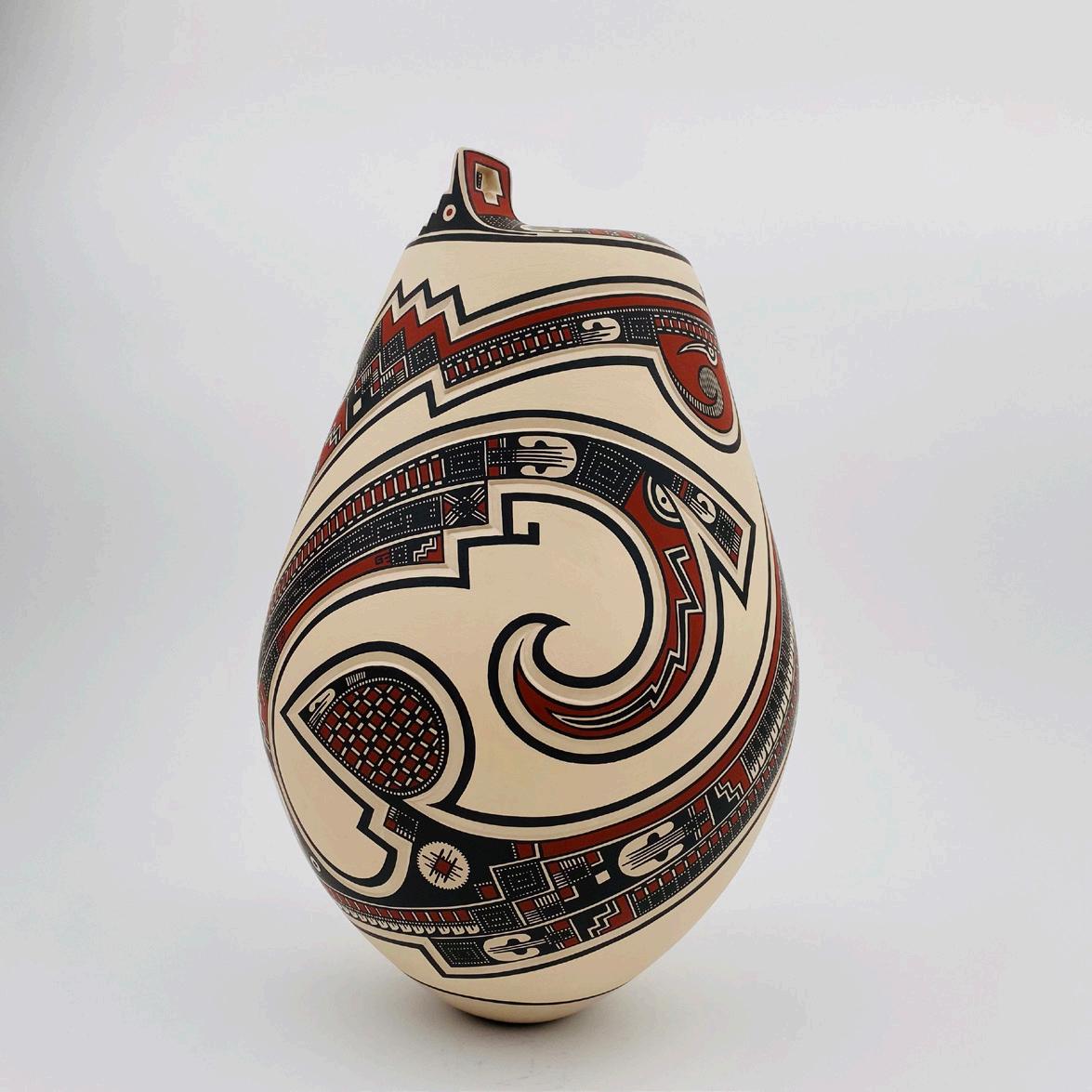 A handmade olla by master potter Tavo Silveria from Mata Ortiz, Chihuahua, Mexico. This ceramic olla is made with ancient traditions from the village of Mata Ortiz in Chihuahua, Mexico. The clay is mined from the Sierra Madre Occidental mountain range, handcoiled and painted with natural dye paint.
