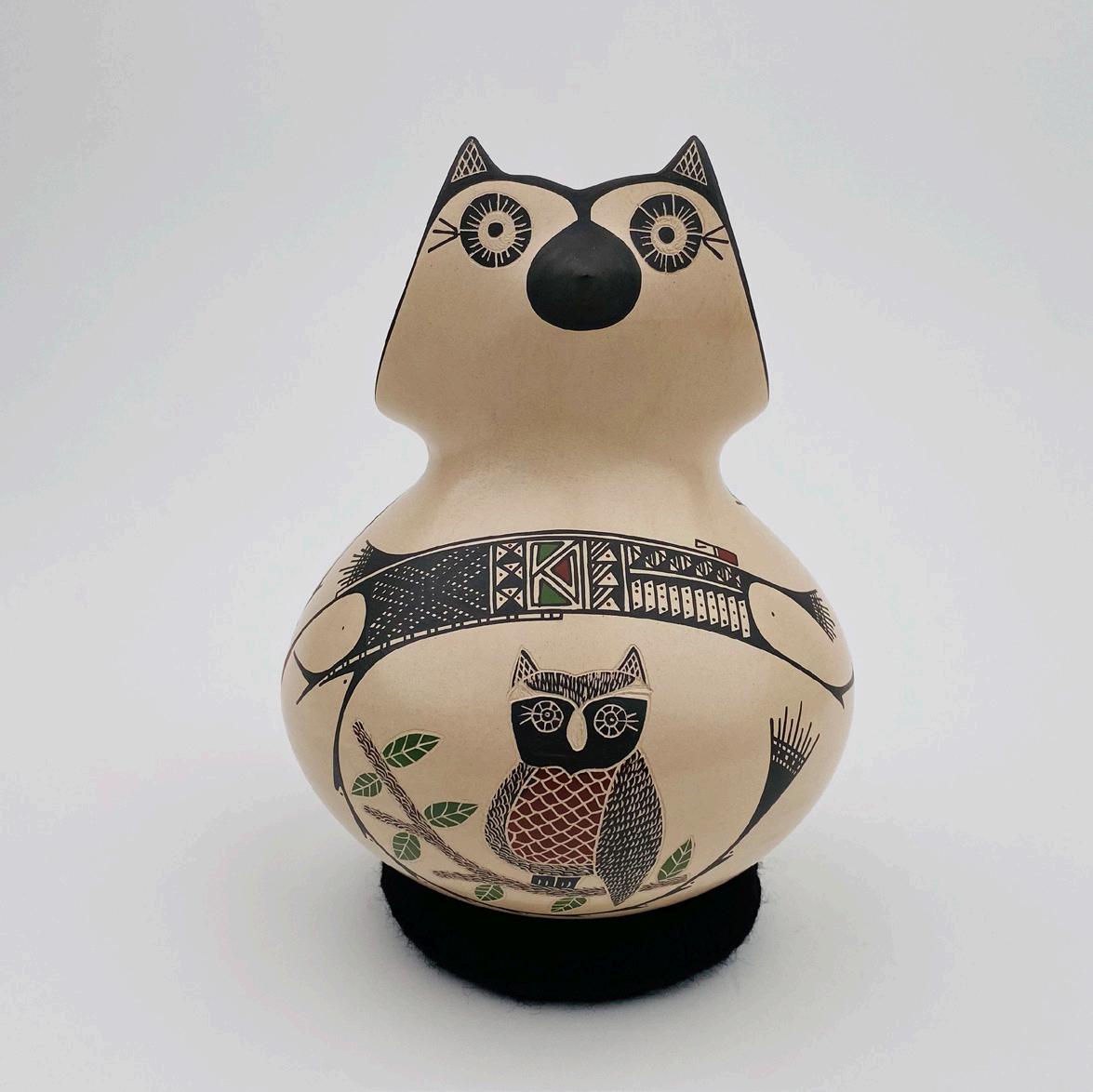 Born in October 1983, Angela began making pots around the age of 15 when she learned from her brother Vidal Corona. She has found a niche in making polychrome owl figures and seed pots draped with lizards. Her sgraffito design and bright colored works are instantly recognizable.