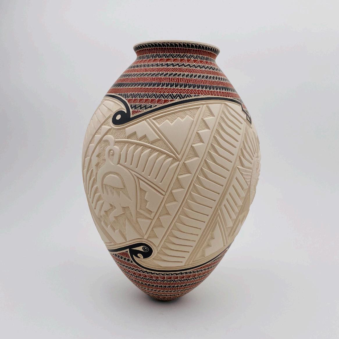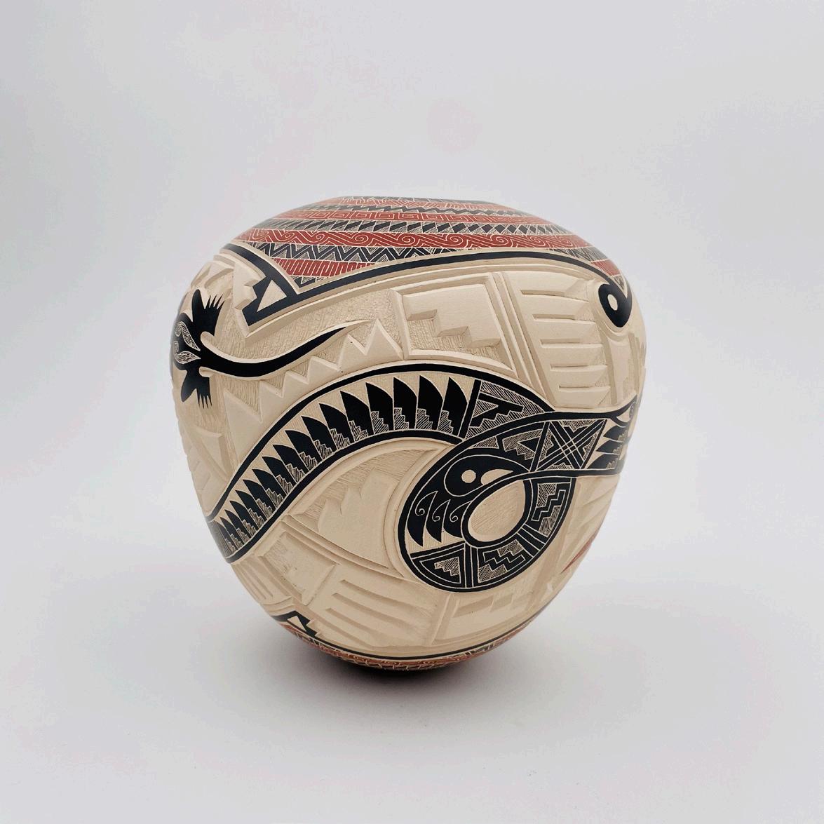 Beautiful Mata Ortiz olla for sale. Handmade by master potter, Martin Olivas Quintana, from Mata Ortiz, Chihuahua, Mexico. This ceramic olla is handmade with ancient traditions from the village of Mata Ortiz in Chihuahua, Mexico. The clay is mined from the Sierra Madre Occidental mountain range, painted with natural dye paint and hand-coiled.