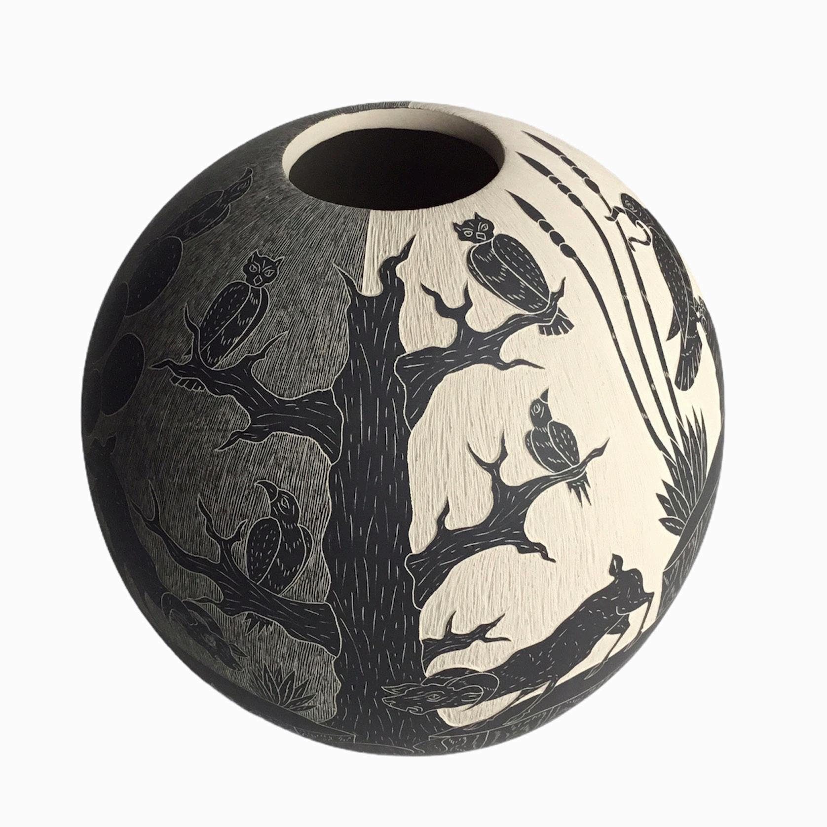 Angel learned to do pottery from his teacher Olivia Dominguez when he arrived to Mata Ortiz from Ciudad Juarez in 2008. Guerrero is very well known for his sgraffito technique. He paints the white clay pot with one color and then he incises the surface to form realistic nature designs.