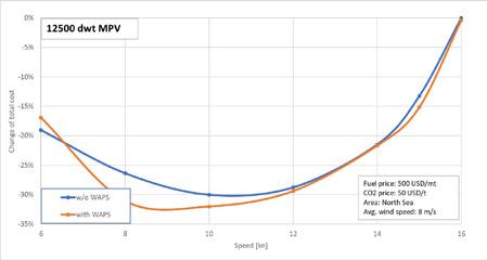 Naturally, a wind assisted propulsion system heavily depends on the wind speeds and if the wind is not strong enough the business case becomes quickly weak. Fig 14 shows on the left side that for an 8 m/s average wind area the cost savings are marginal for speeds above 12 kn and for even lower wind speeds 6 m/s (Bft. 4) the investment costs of the WAPS system cannot be recovered, regardless of speed.