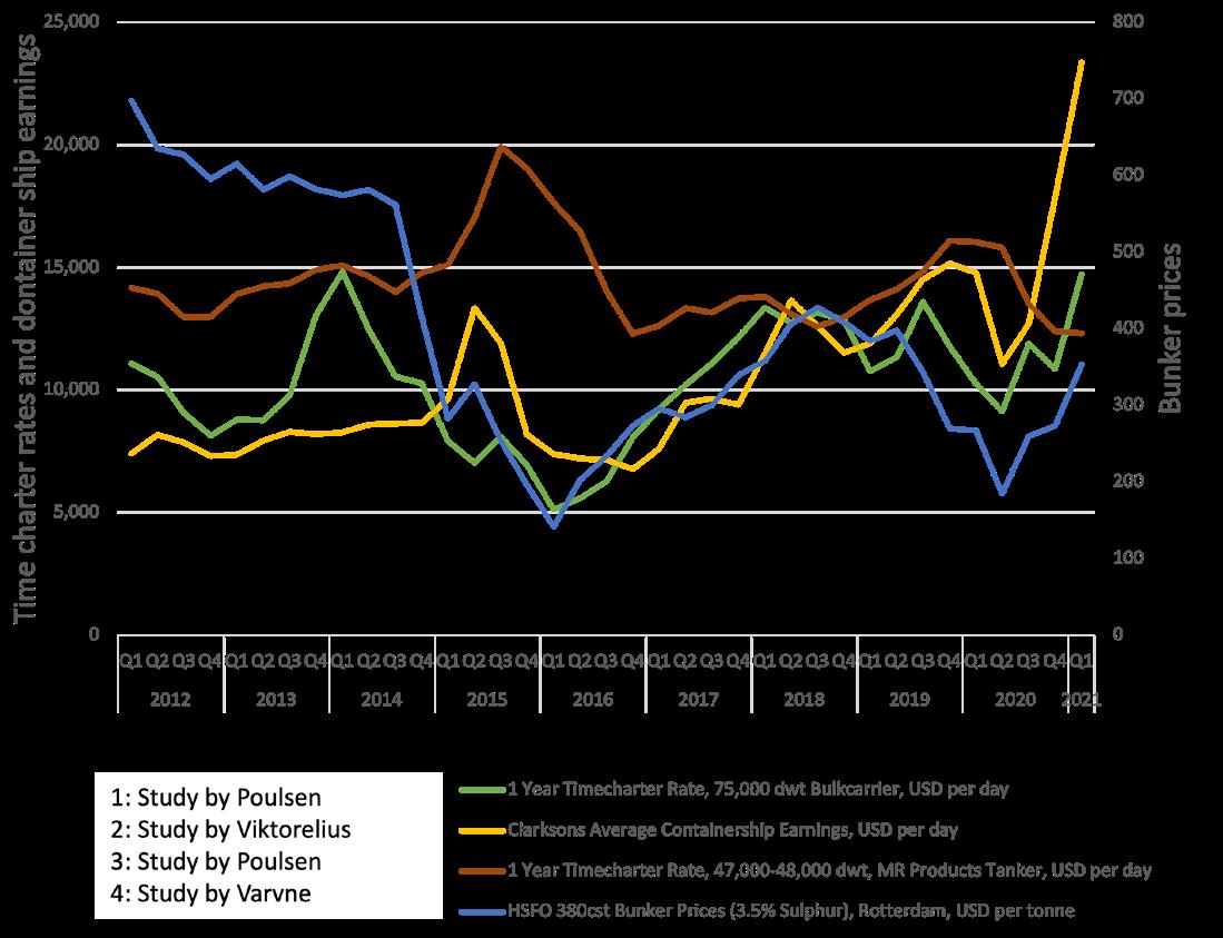 The daily charter rate for such vessel is currently at 8,500 USD/d. The installation cost of the three Flettner rotors are assumed with 2.250 million USD and a yearly maintenance of 2.3% of the initial investment is required. Depreciation is set at 10 years and capital is subject to 4% interest rate. The case study assumes a trip of 10000 nm and considers 60% sailing time (220 days/year) of the vessel. The consumption of the auxiliary power systems is estimated with 2.2 t/d. The electric power needed to spin the three rotors is considered with 100 kW and thus increases the auxiliaries fuel consumption by about 0.5 t/d. Table 5 summarizes these assumptions. Although not yet implemented for shipping, discussions on trading schemes for emissions are ongoing and, at least for the EU, it seems likely that shipping will be included in the ETS. This would mean extra costs for using fossil fuel and currently a ton of CO2 is traded at 40 € (~ 50 USD/t), https://ember-climate.org/data/carbon-price-viewer/.