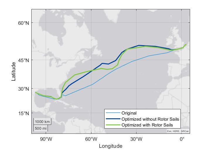 Route optimization (tailored to WAPS) offers considerable additional savings. For transatlantic routes, we estimate for a ship like the “E-Ship 1” average savings (per year) of 8-20% on westbound legs, and 12-38% on eastbound legs, compared to using the Rhumb-line average (straight line on navigation maps using Mercator projection).