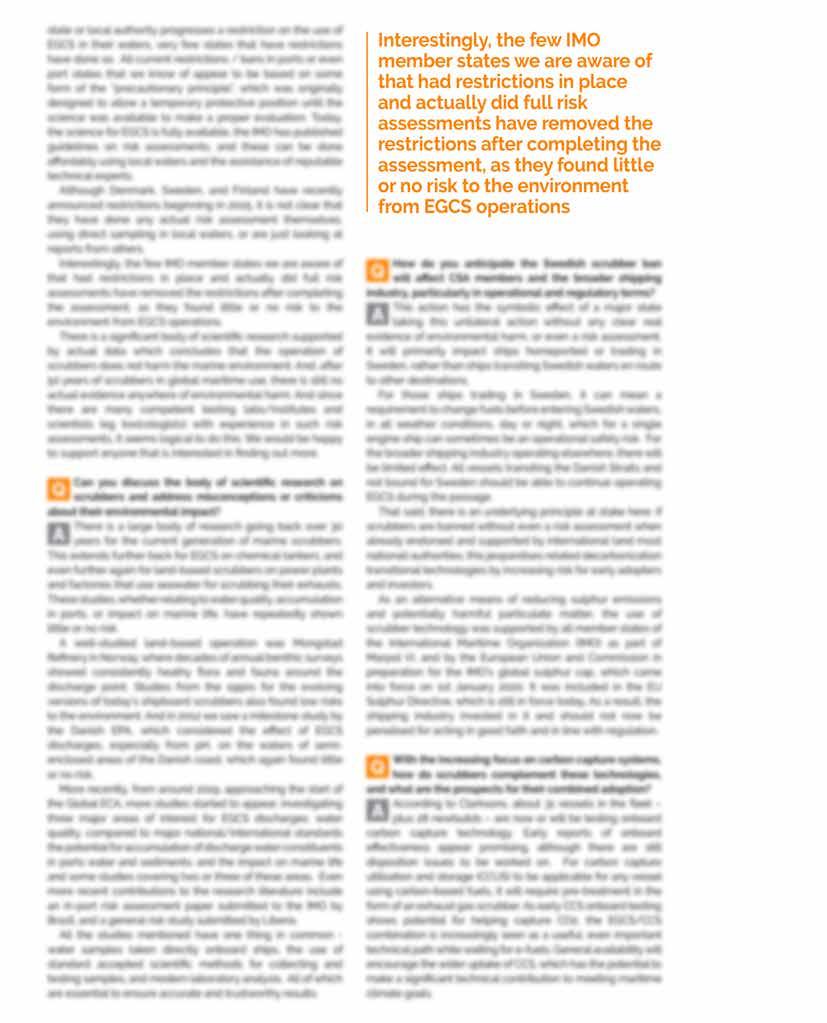 The use of scrubbers comes up again in this issue although this time in a more controversial way. This year sees a ban on the use of open loop scrubbers, already in place in many places, being extended to key jurisdictions such as Denmark. We asked the Clean Shipping Alliance for its view on the ban and whether there is any basis for it. The answers are illuminating as is the reference to how exhaust gas cleaning systems (scrubbers) are crucial for the uptake in onboard carbon capture technology. It goes so far as to say that scrubbers are essential for use while we wait for e-fuels to come online.