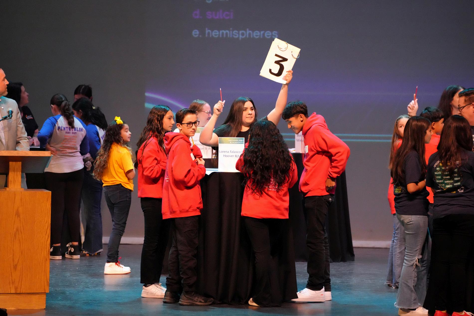 Academic Pentathlon is a countywide student event for grades 6 through 8. It is part of the United States Academic Pentathlon competition. All study guides and necessary materials are provided with team fees. Schools field teams of up to 12 members per grade divided into Honors, Scholastic, and Varsity divisions based on student GPA. Students compete in a series of five academic tests and demonstrations, including fine art, literature, math, science, social science, and a Super Quiz. Awards are presented to teams and individuals.