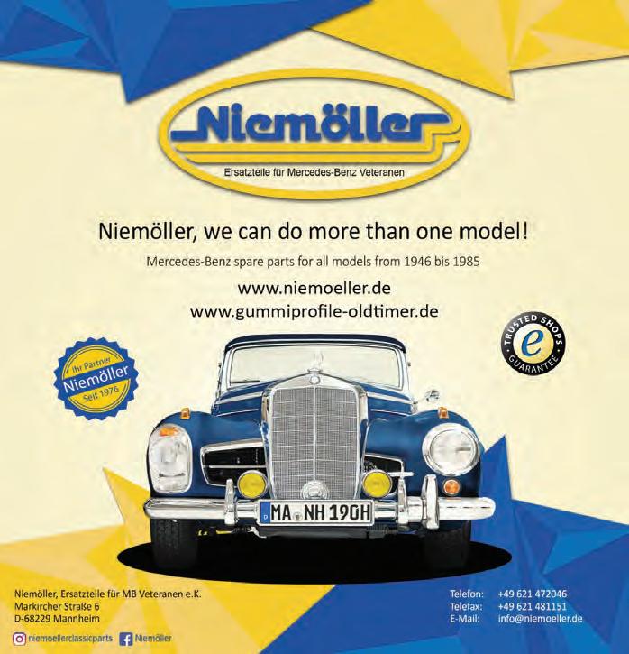 The Next Trading Post Ad Deadline: July 15, 2023 123 USA LLC 87 Adsit Company, Inc. 79 Airstream, Inc C3 Amica 10 Authentic Classics LLC 81 AutoMobilia Magazine 93 Becker AutoSound, LLC 87 Beverly Hills Car Club ......................................95 BMWCCA 87 Bud’s Benz 93 Classic Trim 94 Gill’s Precision Automotive 81 Gooding & Company 7 Gullwing Motorcars Inc 93 J.C. Taylor Antique Auto Insurance 11 K&K Manufacturing 79 Kienle GmbH 13, 81 Lauderdale Speedometer 93 Laurent Nay 81 Liqui Moly 23 Madera Concepts 87 MBCA –Educational Foundation (MBCAEF) 93 MBCA German Trip 83 MBCA Legends of the Autobahn 77 MBCA Mercedes Grande 69 MBCA Formula 1 Austin 14 MBCA – Purchase Name Badges. 94 MBCA –The Star Back Issues 93, 95 Mecum Auctions 1 Mercedes-Benz Cars MBUSA ...................... C4 Mercedes-Benz Lifestyle Collections C2 Metric Motors Inc. 94 Miller’s Inc. 95 Niemöller Spare Parts 87 Pelican Parts 71 Porsche Club of America 87 Tire Rack 3, 4, 5 Unique Cars of Palm Beach 94