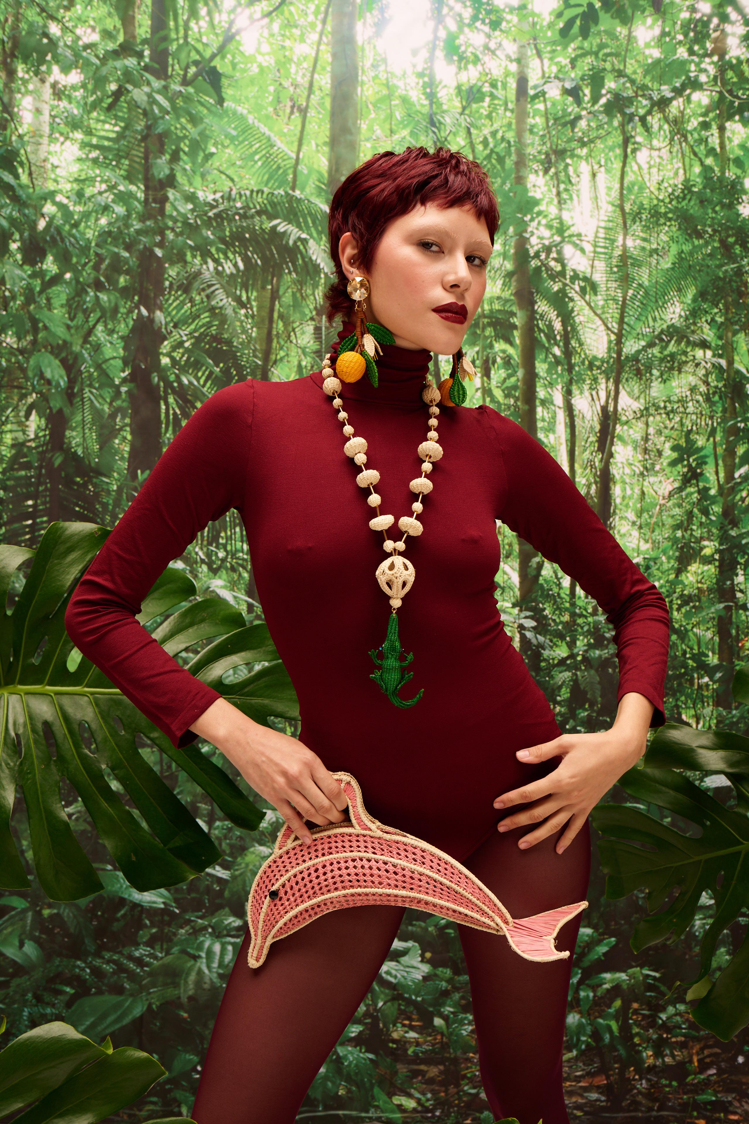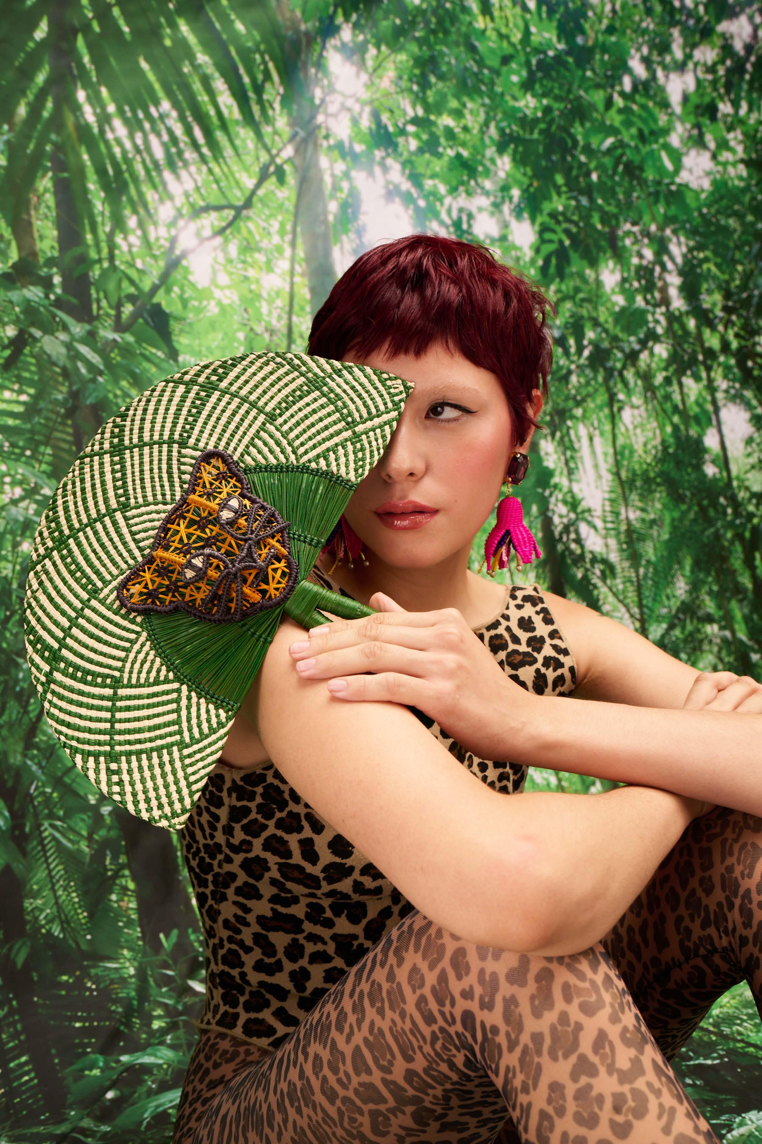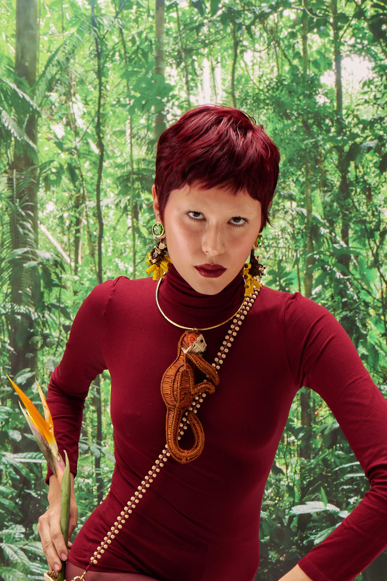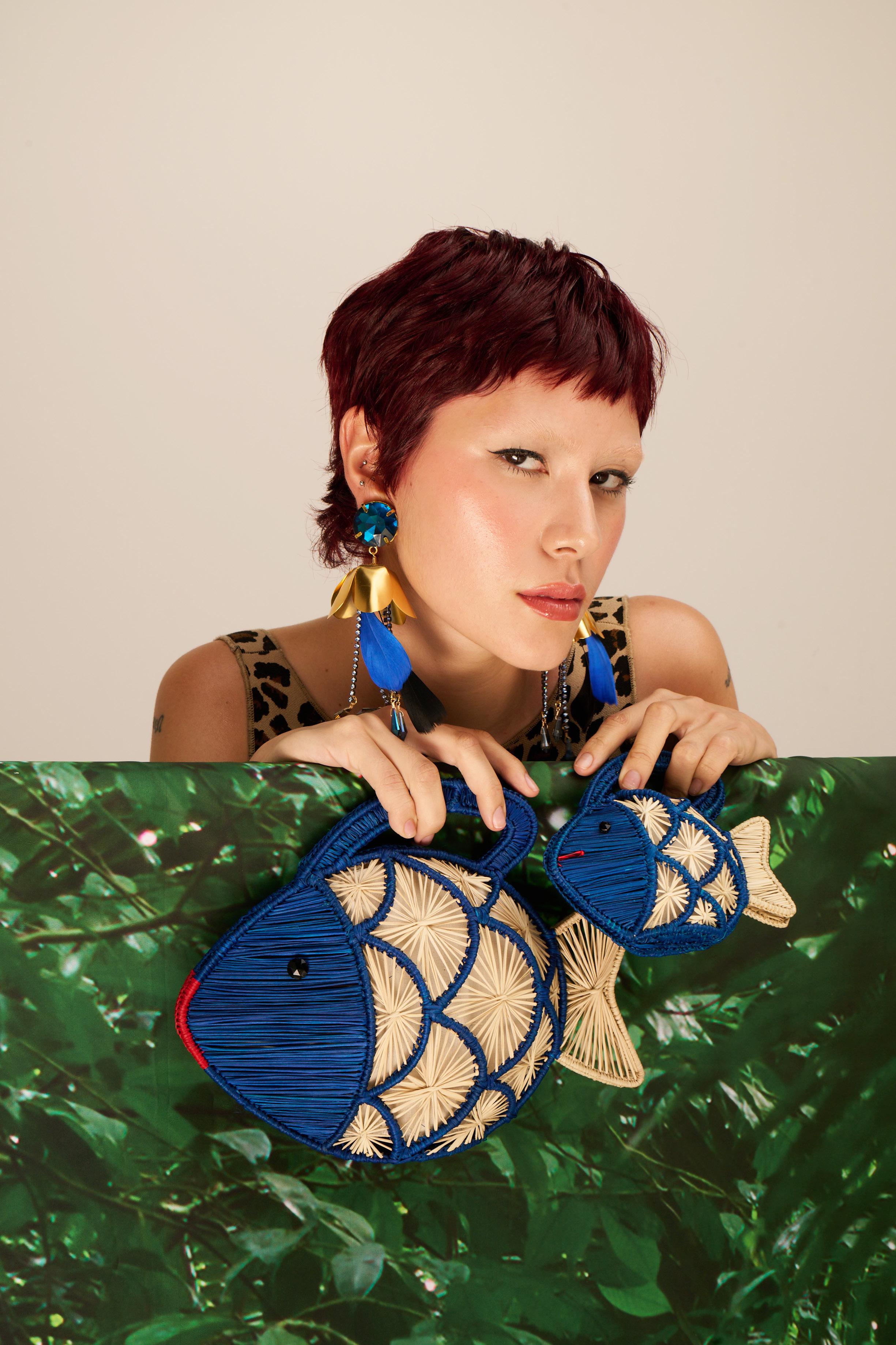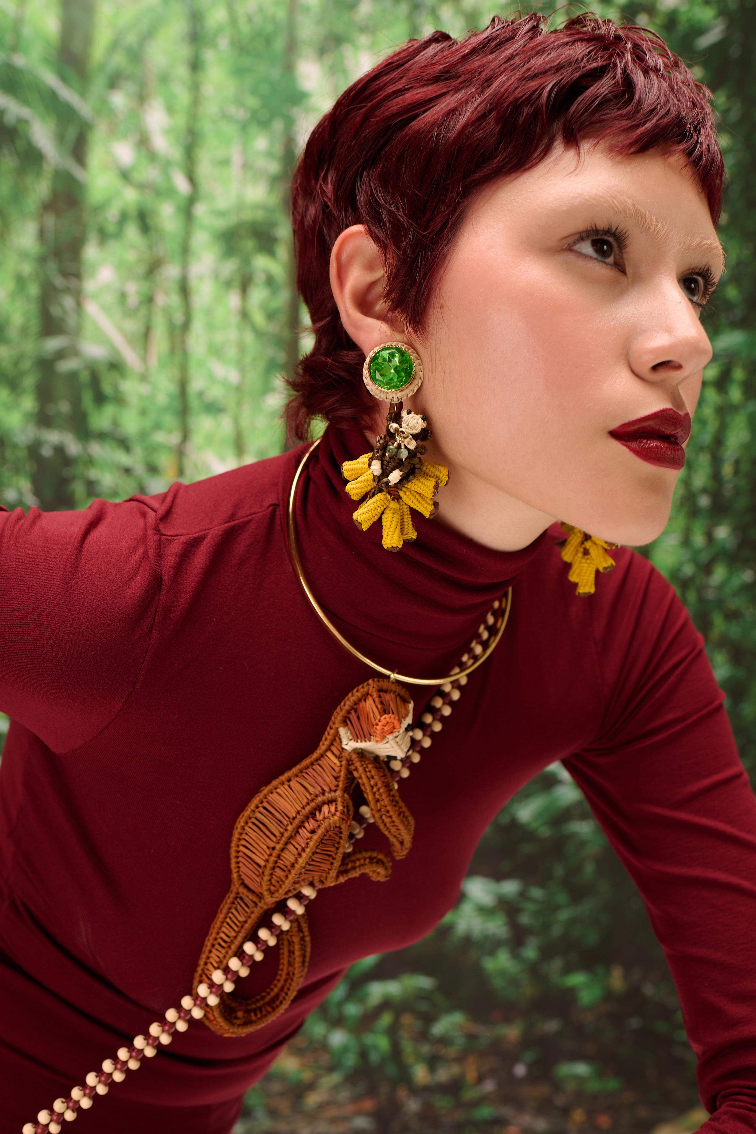A river of colors runs through the forest, and hands weave what the earth whispers. From the heart of Colombia, the forest speaks through our hands. Raffia, crystals, semiprecious stones, gold-plated bronze, and feathers become vessels of its memory. Every piece is crafted in community, carrying the wisdom of generations. In these creations, the Amazon reveals itself- the playful monkeys, the call of fantastic birds, the jaguar’s silent power, the blue branch with black dots,the blossoms of copoazú and banana.We created earrings that dance with you and sway with the wind, necklaces filled with meaning and power, bags to hold your treasures, and handwoven baskets that carry our story in every knot. They carry the soul of the jungle—untamed, radiant, eternal. May you listen to these whispers and let the Amazon speak through you.